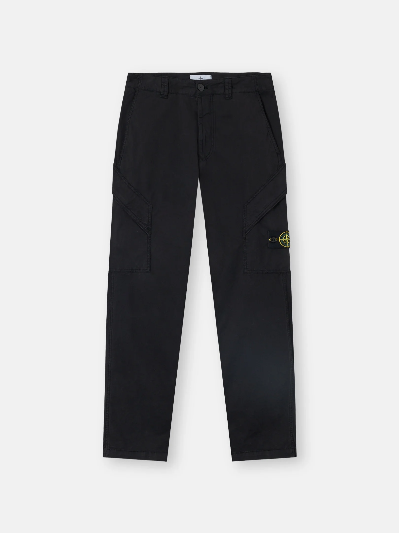 Cargo pants in stretch Supima® cotton twill, featuring angled flap pockets on the legs and a back snap pocket, with zipper and button fly. Garment dyed. FABRIC RESEARCH AND TREATMENT Cargo pants in stretch Supima® cotton twill, made with mercerized Supima® cotton yarn, elasticated in the weft. Supima® - Superior Pima - is the guarantee certificate for the US origin of Pima cottons. This is the noblest species among cottons, due to the greater length, uniformity and strength of the fibers. Garment dyed. STYLE AND FIT Slanted hand pockets. Cargo pockets with angled flap and zipper; left pocket features Stone Island badge. One back pocket with hidden snap. Zipper and button fly. Regular fit. COMPOSITION AND CARE 97% Cotton 3% Elastane / Spandex