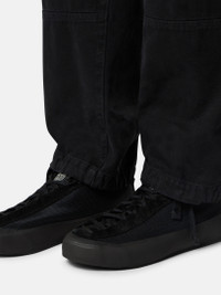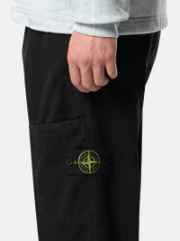Utility cargo pants in organic panama cotton, featuring drawstring cuffs and an elasticated drawstring waistband. Garment dyed with the “OLD” treatment for a slightly worn appearance. FABRIC RESEARCH AND TREATMENT Utility cargo pants in organic panama cotton. Garment dyed with the “OLD” treatment, an exclusive dyeing treatment and subsequent fading on the finished garment for a slightly worn and three-dimensional appearance. STYLE AND FIT Paneled construction. Angled hand pockets. Cargo pocket on front left leg with concealed snap. Back pocket with snap. Stone Island badge on left leg. Cuffs with internal drawstring. Elasticated waistband with internal drawstring. Zipper fly. Loose fit. COMPOSITION AND CARE 100% Cotton