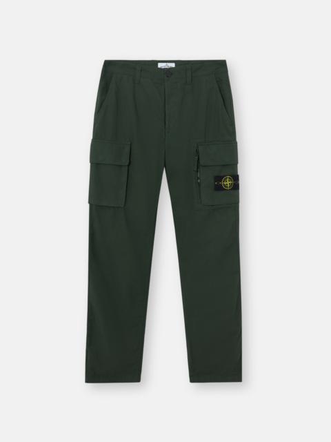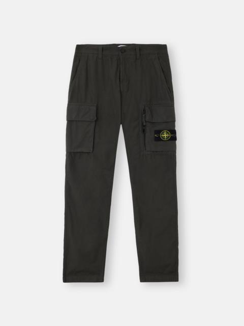 Cargo pants in canvas weave cotton, featuring bellows snap pockets and a back snap pocket, with zipper and button fly. Garment dyed. FABRIC RESEARCH AND TREATMENT Cargo pants in canvas weave cotton. The garment dyeing procedure with specific recipes lends a unique appearance to the piece. STYLE AND FIT Slanted hand pockets. One back pocket with snaps under flap. Bellows flap pocket on each leg with three snaps; left leg pocket features Stone Island badge and second standing pocket with hidden zipper. Zipper and button fly. Regular fit. COMPOSITION AND CARE 100% Cotton