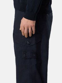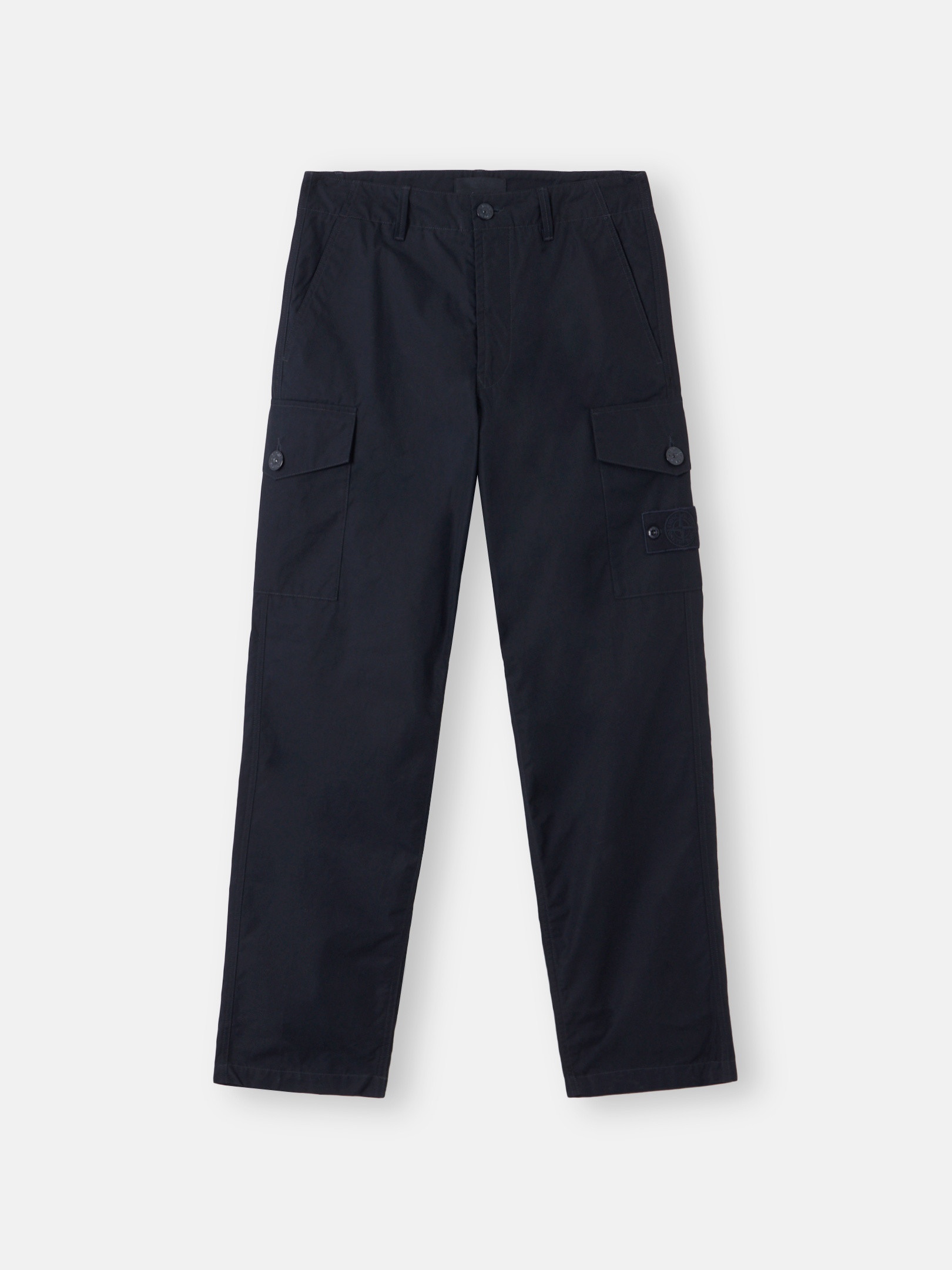 Cargo pants in a cotton canvas made from the finest premium cotton fibers that provide an excellent and entirely natural weather barrier that is windproof, breathable, and durable. FABRIC RESEARCH AND TREATMENT Ghost pieces, derived from the concept of camouflage, are totally monochromatic. Even the Stone Island badge is created in a special monocolor version to blend in with the garment. Cargo pants made of a tightly woven cotton canvas fabric using the finest, long-staple premium organic cotton fibers. The combination of dense weaving and swelling properties of the fiber when wet provides an excellent weather barrier with no need of extra coating or lamination. It is entirely natural, offering a unique level of comfort and touch. It is windproof, breathable and very durable. STYLE AND FIT Slanted hand pockets. Two slit back pockets with hidden snap fastening. Patch pockets on legs with flap and button fastening; the left one features the Stone Island Ghost badge. Zipper and button fly. Regular fit. COMPOSITION AND CARE 100% Cotton