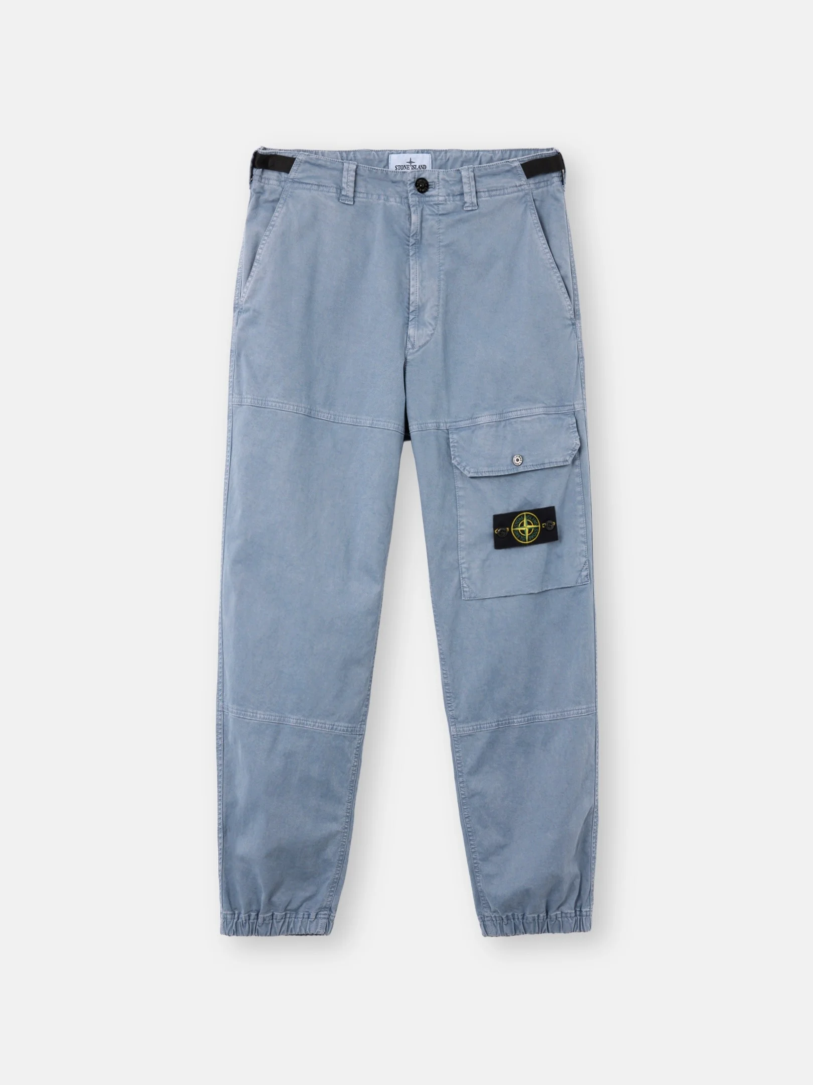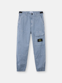 Cargo pants in organic cotton stretch broken twill, featuring elasticated cuffs, and an adjustable waistband. Garment dyed with the “OLD” treatment for a slightly worn appearance. FABRIC RESEARCH AND TREATMENT Cargo pants in organic cotton broken twill with stretch. Garment dyed with the “OLD” treatment, an exclusive dyeing treatment and subsequent fading on the finished garment for a slightly worn and three-dimensional appearance. STYLE AND FIT Paneled construction. Angled hand pockets. Bellows cargo pocket on front left leg with flap, snap, and Stone Island badge. Back bellows pockets with flap and snap. Back right pocket with applied utility snap pocket. Elasticated cuffs. Side tape adjusters at waistband. Zipper fly and button fastening. Loose fit. COMPOSITION AND CARE 98% Cotton 2% Elastane / Spandex