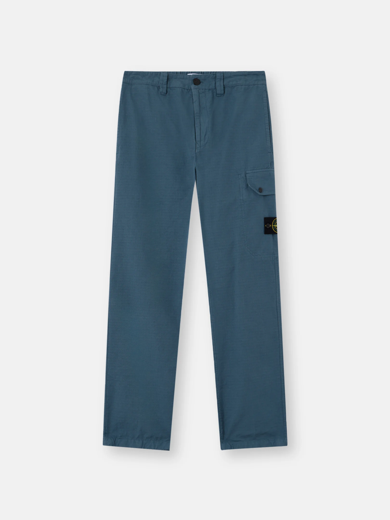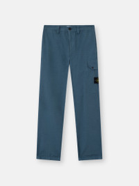 Pants in organic cotton ripstop featuring snap-fastened leg and back pockets, adjustable cuffs with inner drawstring, and a back elasticated waistband. Garment dyed. FABRIC RESEARCH AND TREATMENT Pants in organic cotton ripstop. Garment dyed. STYLE AND FIT Standing hand pockets. Two back pockets with two snaps under flaps. Pocket on left leg with two snaps and Stone Island badge. Cuffs with inner drawstring. Elasticated waistband in back. Zipper and button fly. Loose fit. COMPOSITION AND CARE 100% Cotton