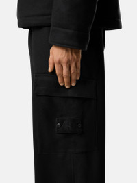 Cargo pants in carded wool nylon flannel with multiple pockets, elasticated cuffs with zippered gussets, and nylon lining. FABRIC RESEARCH AND TREATMENT Ghost pieces, derived from the concept of camouflage, are totally monochromatic. Even the Stone Island badge is created in a special monocolor version to blend in with the garment. Cargo pants made of a carded wool and nylon flannel. Nylon lining. STYLE AND FIT Standing hand pockets. Two back pockets with fixed flap and concealed snap. Patch pocket with flap and concealed snaps on each leg; Stone Island Ghost badge on left leg pocket. Elasticated cuffs and zippered gusset on leg bottoms. Elasticated waistband with internal drawstring. Zipper and snap fly. Loose fit. COMPOSITION AND CARE 80% Virgin Wool 20% Polyamide / Nylon