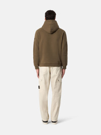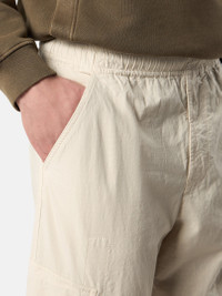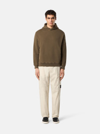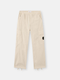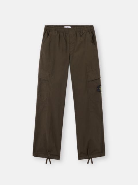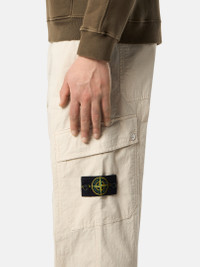 Cargo pants made from organic cotton ripstop with a comfortable stretch component, featuring drawstring cuffs and an elasticated waistband. Garment dyed. FABRIC RESEARCH AND TREATMENT Cargo pants made of an organic cotton ripstop of military origin, with custom-made Stone Island checkering. The addition of a stretch component in the weaving lends great comfort and freedom of movement to the garment. Garment dyed. STYLE AND FIT Slanted hand pockets. On the back, patch pocket on the right side; double patch pocket on the left side, one with snap fastening. Patch pocket on left with flap, snap fastening the Stone Island badge. Drawstring in cuffs. Elasticated waistband with inner drawstring. Zipper fly. Loose fit. COMPOSITION AND CARE 95% Cotton 5% Elastane / Spandex