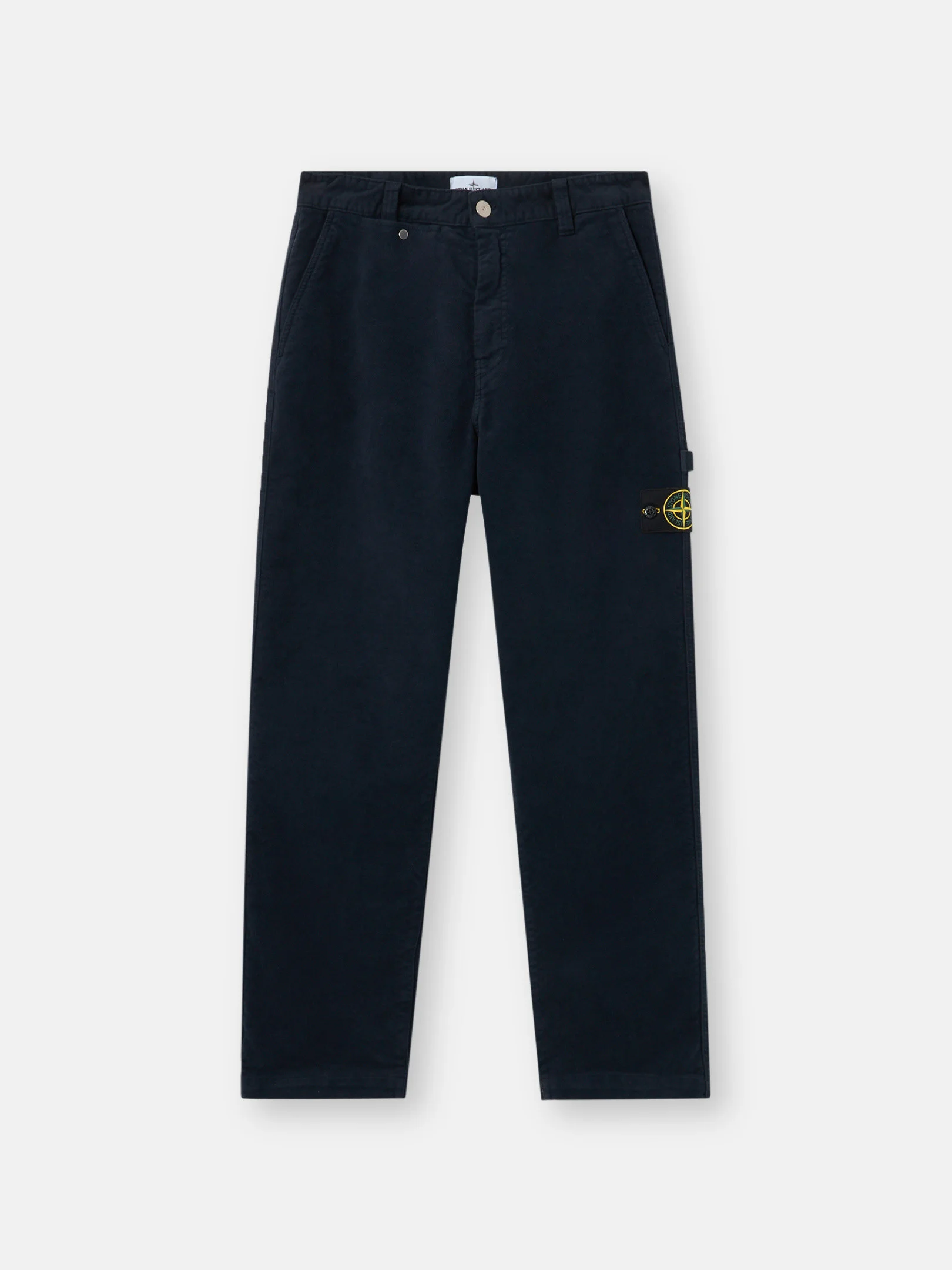 Pants in robust cotton moleskin with hand pockets and multiple pockets on the back. Garment dyed. FABRIC RESEARCH AND TREATMENT Pants in robust cotton moleskin. The garment dyeing process lends a unique appearance to the piece. STYLE AND FIT Slanted hand pockets. Small pocket on right side under waistband with snap. Back patch pockets with slanted entrance and snap; tape loop under left pocket. Small vertical pocket with snap on back of right leg. Stone Island badge on left leg. Zipper and button fly. Loose fit. COMPOSITION AND CARE 100% Cotton