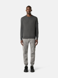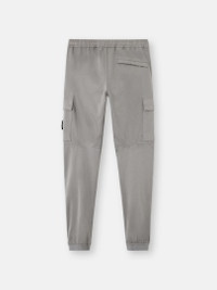 Cargo pants in stretch organic cotton and wool satin, featuring multiple pockets, elasticated cuffs, and an elasticated drawstring waistband. Garment dyed. FABRIC RESEARCH AND TREATMENT Cargo pants in stretch organic cotton and wool satin. Garment dyed. STYLE AND FIT Standing hand pockets with hidden zipper. One back pocket with hidden snap under fixed flap. Bellows flap pocket on each leg with two snaps hidden under flap; left pocket features Stone Island badge. Shaped knees. Elasticated band at cuffs. Elasticated waistband with inner drawstring. Zipper fly. Regular tapered fit. COMPOSITION AND CARE 93% Cotton 5% Wool 2% Elastane / Spandex