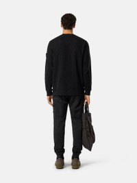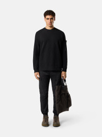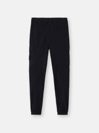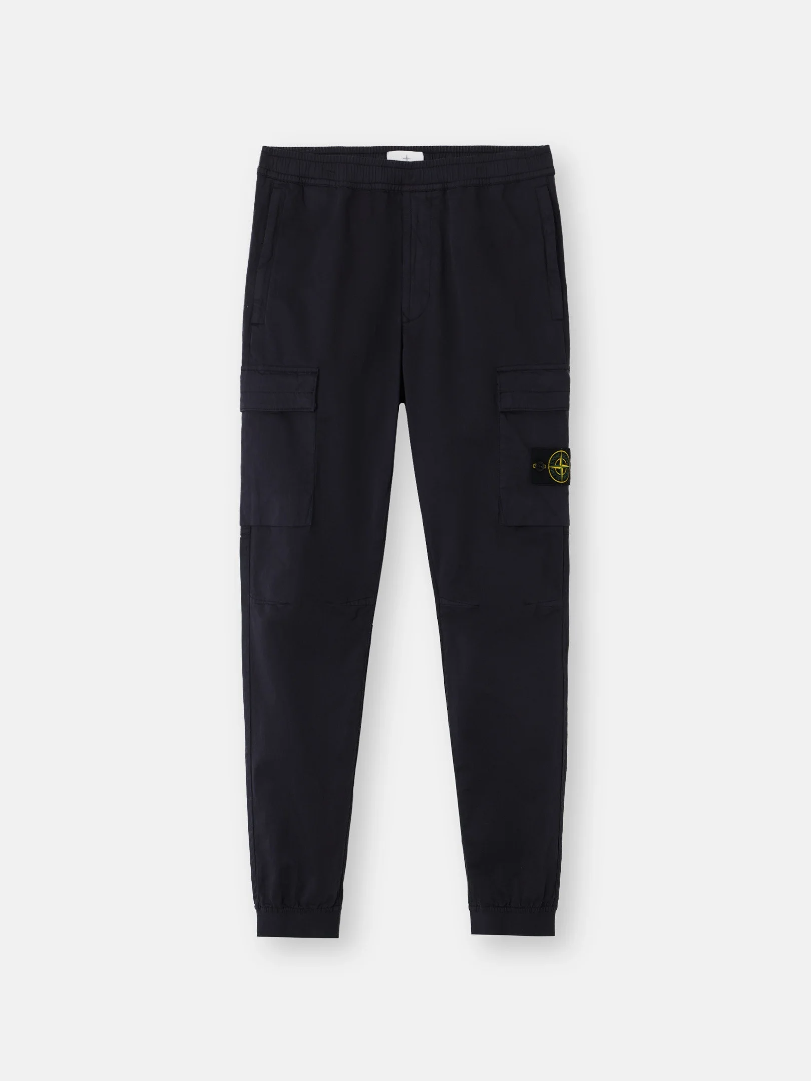 Cargo pants in stretch organic cotton and wool satin, featuring multiple pockets, elasticated cuffs, and an elasticated drawstring waistband. Garment dyed. FABRIC RESEARCH AND TREATMENT Cargo pants in stretch organic cotton and wool satin. Garment dyed. STYLE AND FIT Standing hand pockets with hidden zipper. One back pocket with hidden snap under fixed flap. Bellows flap pocket on each leg with two snaps hidden under flap; left pocket features Stone Island badge. Shaped knees. Elasticated band at cuffs. Elasticated waistband with inner drawstring. Zipper fly. Regular tapered fit. COMPOSITION AND CARE 93% Cotton 5% Wool 2% Elastane / Spandex