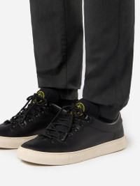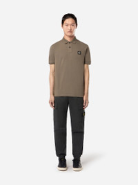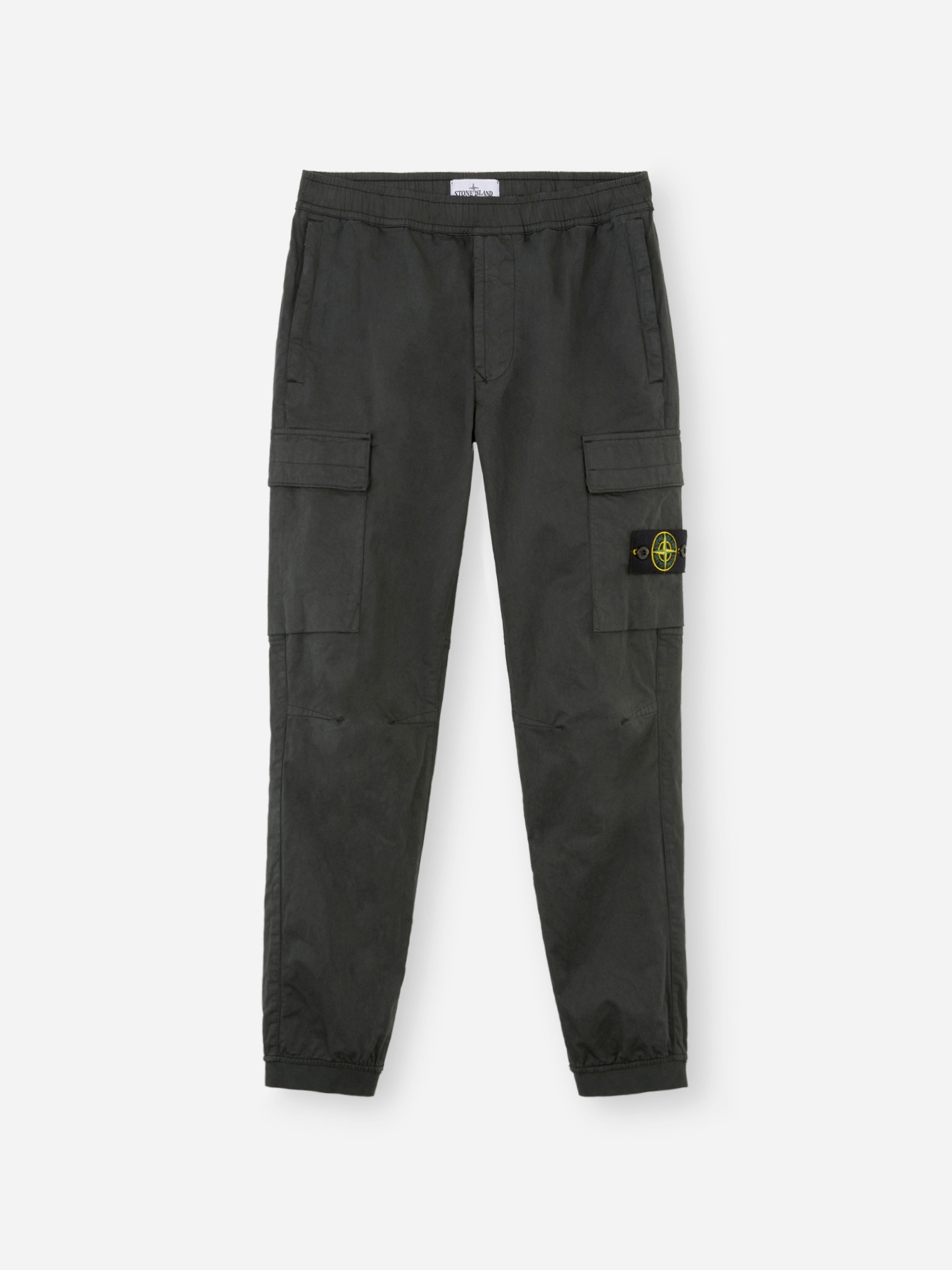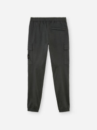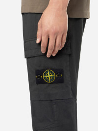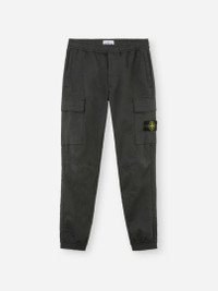 Cargo pants in stretch cotton-wool satin, featuring zipper hand pockets, patch pocket on the legs, and elasticated waistband with drawstring. Garment dyed. FABRIC RESEARCH AND TREATMENT Cargo pants in stretch cotton-wool satin. Garment dyed. STYLE AND FIT Welt hand pockets with zipper fastening. One slanted slit pocket on back with hidden snap fastening. One bellows patch pocket on each leg, with flap and hidden snap fastenings; the left pocket features the Stone Island badge. Shaped knee. Elasticated band at leg bottoms. Elasticated waistband with inner drawstring. Zipper fly. Regular tapered fit. COMPOSITION AND CARE 93% Cotton 5% Wool 2% Elastane / Spandex