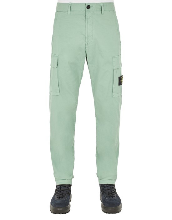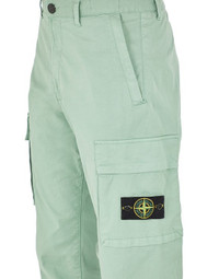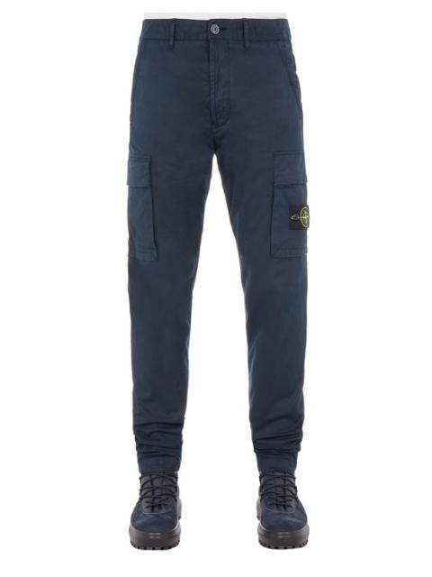FABRIC RESEARCH AND TREATMENT Cargo pants in stretch cotton gabardine. Garment dyed. STYLE Regular tapered fit. Slanting hand pockets with hidden zipper fastening. One back pocket with hidden snap fastening. Shaped inlay of a cotton nylon fabric featuring the embroidery of the Stone Island logo above the back pocket at the waist. One bellows pocket on each leg, with fixed flap and hidden zipper fastening; the left pocket features the Stone Island badge. Zipper and button fly. DETAILS Width at end: 18.0 cm COMPOSITION 97% Cotton, 3% Elastane / Spandex