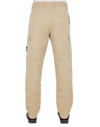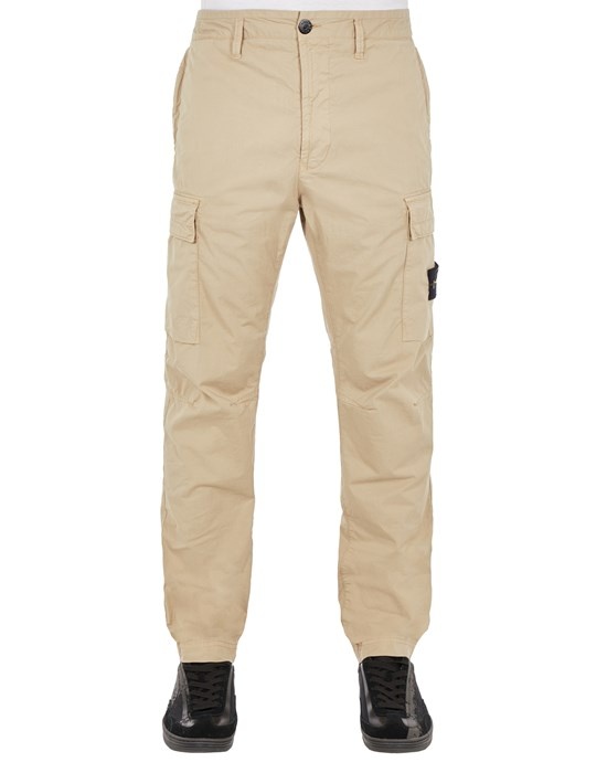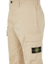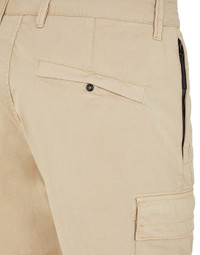FABRIC RESEARCH AND TREATMENT Cargo pants in stretch cotton gabardine. Garment dyed. STYLE Regular tapered fit. Hand pockets on seam, with hidden zipper fastening. One back pocket, with hidden snap fastening. One bellows pocket on each leg, with flap and hidden snap fastenings; the left one features the Stone Island badge. Zipper and button fly. DETAILS Width at end: 17.0 cm COMPOSITION 97% Cotton, 3% Elastane / Spandex
