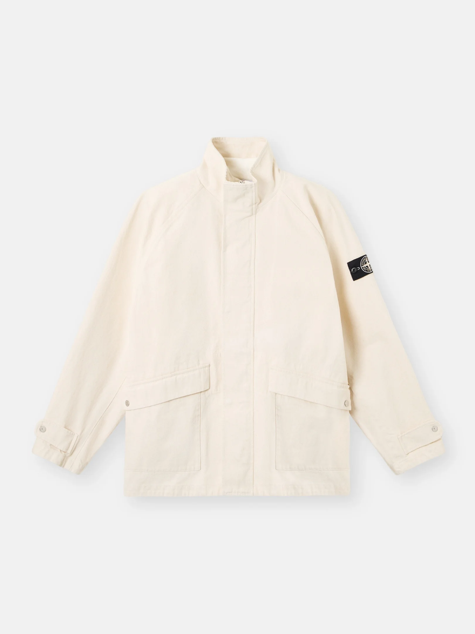 Short parka made in part with recycled cotton derived from an elaborate recovery and regeneration process that reuses material scraps from the Stone Island production chain. Washed. FABRIC RESEARCH AND TREATMENT The Stone Island Raw Beauty project reuses cotton material scraps from the Stone Island production chain. The scraps selected in the production plants are reprocessed to obtain new blended yarns, containing at least 50% recovered material. The fabrics derived from this elaborate recovery and regeneration process are used for new garments. Short parka made from 60% recycled cotton and 40% conventional cotton. The unbleached fabric features some aesthetic impurities that are typical of raw cotton and should be considered an intrinsic and natural part of the material. Washed. STYLE AND FIT Collar can be worn upright or folded down. Large, slanted patch pockets with flap fixed on one side, and with snap on rubber disc on the other. Raglan sleeves. White Stone Island fabric research badge on left sleeve. Large elbow patches inspired by debossed rubber patches of archival Stone Island garments from the 1980s. Adjustable strap at cuffs held by snaps. Two-way zipper under snap-fastened placket. Detachable cotton lining with stand collar, one inner pocket, and snap fastening, attached to the outer garment using a system of ties adapted from those used in the sailing world. COMPOSITION AND CARE Garment: 100% Cotton. Garment Details: 50% Cotton 50% Lyocell. Detachable Internal Garment: 100% Cotton. Lining: 100% Cotton. Padding: 50% Cotton 50% Polylactide / Pla
