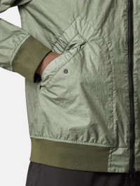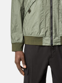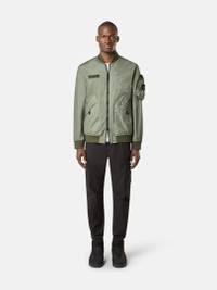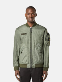 Bomber jacket in a three-layer light performance fabric protected by an imperceptible polyester base, featuring tape applique with loops on chest and a back vent. Garment dyed. FABRIC RESEARCH AND TREATMENT Bomber jacket made of Membrana 3L TC, a three-layer light performance fabric made from an opaque nylon outer face laminated to a breathable, water-resistant membrane, protected by an imperceptible polyester base. Stone Island's garment dyeing expertise gives an outstanding color to the outer face while preserving the performance features of the inner membrane. The addition of a special agent to the dye formula makes the piece anti-drop. STYLE AND FIT Ribbed collar. Nylon tape applique with loops on chest. Slanted hand pockets with snap fastening on tape. Rounded bellows pocket on the left sleeve with zipper fastening and Stone Island badge. Back vent with snap fastening on tape. Ribbed cuffs and bottom band. Two-way zipper fastening. COMPOSITION AND CARE External Fabric: Outer Layer: 100% Polyamide / Nylon. Membrane: 100% Polyurethanic Resin. Inner Layer: 100% Polyester. Ribbing: 95% Polyamide / Nylon 5% Elastane / Spandex. Yoke Lining: 100% Polyamide / Nylon