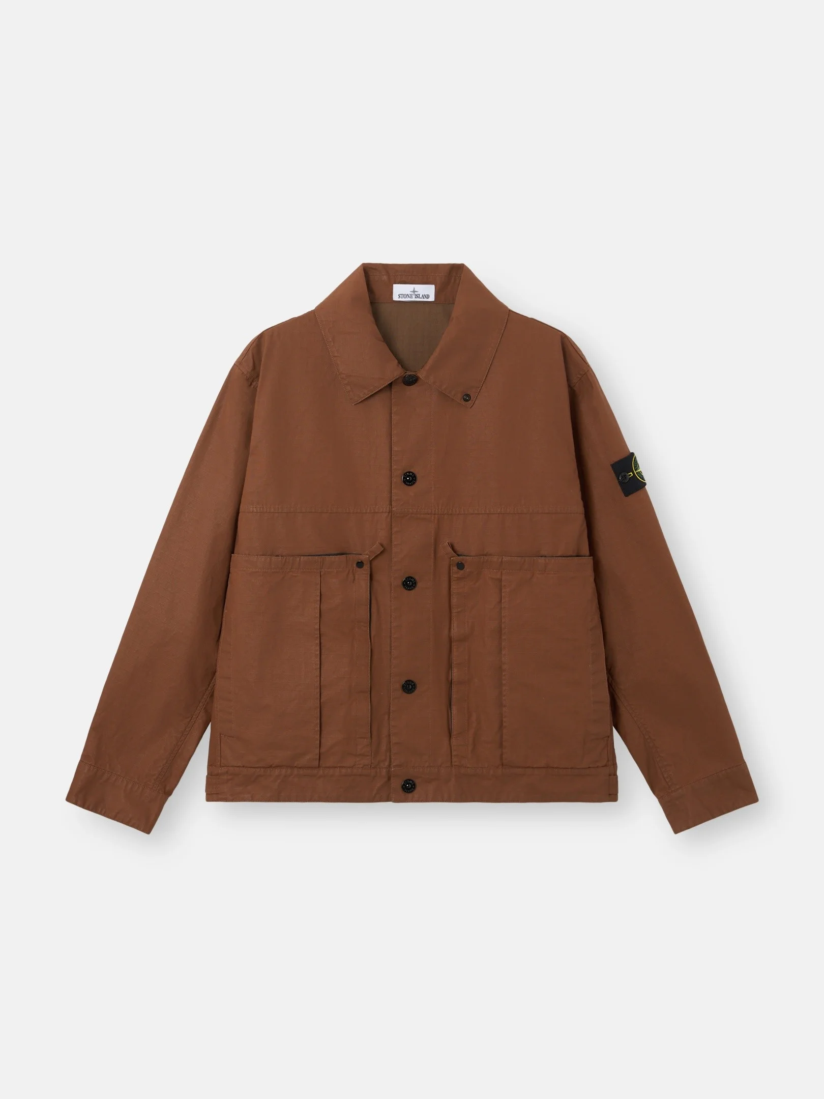 Coach jacket in cotton ripstop double-coated with a pigmented resin that creates a dimensional effect, featuring large hand pockets, adjustable cuffs, and a snap fastening. FABRIC RESEARCH AND TREATMENT Coach jacket in resin-treated cotton ripstop. The piece-dyed fabric is coated on the outer face with a double application of a special pigmented resin, creating a dimensional effect due to the overlapping with the colored base. STYLE AND FIT Collar with contrast undercollar and concealed snap to wear standing. Front yoke. Large patch hand pockets with hook-and-loop fastening along top and side, snap and loop at corner, and pleat detail on front. Second vertical hand pockets. Stone Island badge on left sleeve. Adjustable cuffs with snap and snap placket. Fixed flap on back shoulders. Adjustable side tab at bottom hem with snap. Snap fastening. COMPOSITION AND CARE External Fabric: 100% Cotton Coating: 100% Polyurethanic Resin Pocket Bag: 100% Cotton