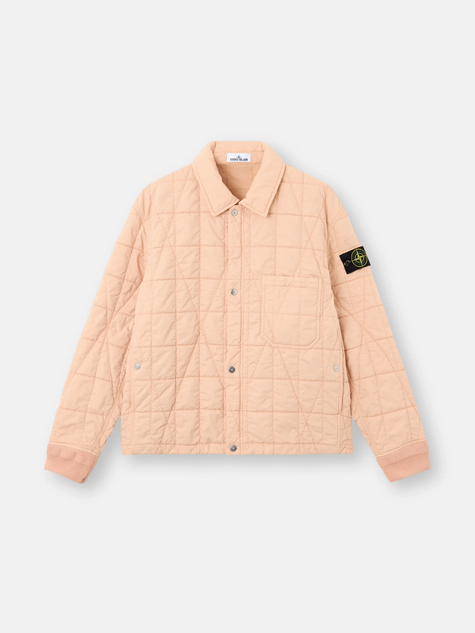Quilted coach jacket in cotton-nylon canvas with a resin coating for mild water and wind resistance, padded with PrimaLoft®-TC, featuring knit cuffs and multiple pockets. Garment dyed with anti-drop. FABRIC RESEARCH AND TREATMENT Coach jacket in a micro-brushed matt canvas made from organic cotton and recycled nylon, resin-coated on the reverse side to achieve mild water and wind resistance. The fabric is quilted with a multi-axial pattern onto an internal padding substrate. Padded with PrimaLoft®-TC, an exclusive blend of high-performance insulating fibers, 70% recycled, engineered with Stone Island for garment dyeing. Garment dyed using specific double dye recipes with the addition of a special anti-drop agent. STYLE AND FIT Patch chest pocket with concealed snap on left side. Vertical hand pockets with internal tape trim and snap. Internal top-entry pockets. Stone Island badge on left sleeve. Knit ribbed cuffs with contrast-stitched band. Two-way zipper fastening under snap placket. COMPOSITION AND CARE External Fabric: 65% Cotton 35% Polyamide / Nylon Ribbing: 100% Cotton Lining: 100% Polyamide / Nylon Padding: 100% Polyester