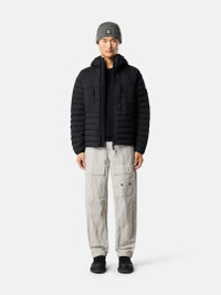 Down jacket in a single layer of light stretch nylon with seamless tunnels for improved feather hold, featuring a padded hood and invisible zipper pockets. Garment dyed with anti-drop. FABRIC RESEARCH AND TREATMENT Hooded down jacket in a light single layer stretch fabric made with 86% recycled nylon that undergoes a special weaving technique automatically creating the feather compartments directly from the loom. The seamless feather tunnels substantially increase the hold of the down. The finished garment is padded with direct injection with the finest feathers, specifically treated to resist garment dyeing. Garment dyed with the addition of a special anti-drop agent. RDS - Responsible Down Standard certified. STYLE AND FIT Padded hood with elasticated tape trim. Standing chest pockets and hand pockets with invisible zipper. Flat back yoke. Stone Island badge on left sleeve. Elasticated tape trim at cuffs. Drawcord at hem. Hidden two-way zipper fastening with one snap on inner placket. COMPOSITION AND CARE External Fabric: 86% Polyamide / Nylon 14% Elastane / Spandex. Hood: 87% Polyamide / Nylon 13% Elastane / Spandex. Lining: 86% Polyamide / Nylon 14% Elastane / Spandex. Hood Lining: 87% Polyamide / Nylon 13% Elastane / Spandex. Garment Padding: Duck Down (Minimum 90% Down) 90% Duck Down 10% Duck Feather. Contains Non-textile Parts Of Animal Origin