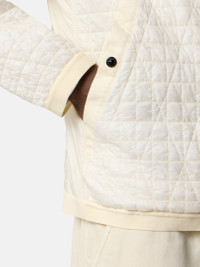 Padded jacket in light nylon rep with a resin coated interior that makes it wind resistant and take on a crinkled appearance. Removable knit insert with hood. Garment dyed with anti-drop. FABRIC RESEARCH AND TREATMENT Padded hooded jacket in a light nylon rep with an ultra-tight weaving construction. The fabric features multiaxial quilting and an internal padding layer. The resin coating of its inner face makes it wind resistant and mildly water resistant. Due to the uneven penetration of color into the resin-coated fabric, the dye bath lends a crinkled appearance to the surface. The addition of a special agent to the dye formula makes the piece anti-drop. Removable ribbed knit insert with hood. STYLE AND FIT Removable ribbed knit insert with hood and zipper fastening on tape that attaches to garment with snaps. Hood with snap-fastened tape drawstring. Raglan sleeves. Hand pockets with diagonal tape trim and snap. Flat inlay at sides and under arms. Stone Island badge on left sleeve. Elasticated tape at cuffs. Snap fastening on nylon tape. COMPOSITION AND CARE Garment: 100% Polyamide / Nylon. Coating: 100% Polyurethanic Resin. Lining: 100% Polyamide / Nylon. Hood Lining: 100% Polyamide / Nylon. Padding: 100% Polyester. Detachable Part: 48% Virgin Wool 43% Cotton 8% Polyamide / Nylon 1% Elastane / Spandex