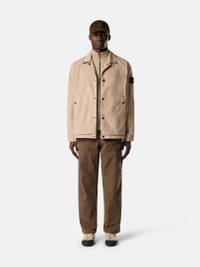 Coach jacket in lightweight polyester canvas with a matt appearance and cotton-like hand, featuring multiple pockets, a drawcord hem, and snap fastening. Garment dyed with anti-drop. FABRIC RESEARCH AND TREATMENT Coach jacket in lightweight canvas made with 60% recycled polyester, featuring a super matt appearance and a cotton-like hand. The fabric compacts and takes on its final appearance through the garment-dyeing procedure at 130° under pressure. The addition of a special agent to the dye recipe makes the garment anti-drop. STYLE AND FIT Collar with snap to wear standing. Angled welt hand pockets with double snap. Internal top-entry pockets. Raglan sleeves on back. Stone Island badge on left sleeve. Internal elasticated cuff. Drawcord at hem. Snap fastening. COMPOSITION AND CARE Garment: 64% Polyester 36% Elastomultiester / Elasterel-p Garment Details: 70% Polyester 30% Polyamide / Nylon