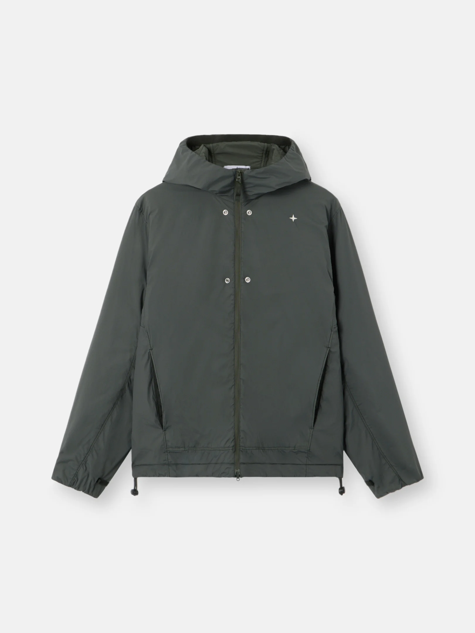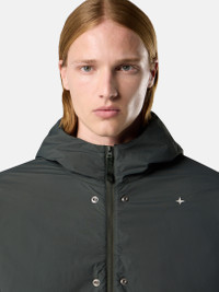 Hooded jacket in a light, high-performance nylon fabric with waterproof zipper fastenings, heat-taped seams, and a detachable lining. Enhanced color depth from garment dyeing. FABRIC RESEARCH AND TREATMENT Hooded jacket made of a light, high-performance fabric with a clean appearance, using fine denier microfiber nylon yarns. A very thin wind- and water-resistant coating is applied to the textile base. The increased stretch component makes this fabric super comfortable. The garment dyeing process enhances the color rendering of the fabric. STYLE AND FIT Hood with contour drawstring, horizontal drawcord and visor. Embroidery of Stone Island star on chest. Slanted hand pockets with fixed flap and waterproof zipper. Yoke and raglan sleeves on back. Tightening hook-and-loop strap at cuffs. Waterproof two-way zipper fastening. Heat-taped seams. Detachable internal lining features standing hand pockets with internal mesh insert, drawcord in bottom hem, and two-way zipper fastening and is attached to outer garment with snaps. COMPOSITION AND CARE External Fabric: 89% Polyamide / Nylon 11% Elastane / Spandex. Coating: 100% Polyurethanic Resin. Lining: 94% Polyamide / Nylon 6% Elastane / Spandex. Hood Lining: 94% Polyamide / Nylon 6% Elastane / Spandex. Padding: 100% Polyester
