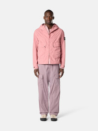 Hooded jacket in lightweight polyester canvas with a matt appearance and cotton-like hand, featuring multiple pockets, adjustable cuffs, a drawcord hem, and two-way zipper. Garment dyed with anti-drop. FABRIC RESEARCH AND TREATMENT Hooded jacket in lightweight canvas made with 60% recycled polyester, featuring a super matt appearance and a cotton-like hand. The fabric compacts and takes on its final appearance through the garment-dyeing procedure at 130° under pressure. The addition of a special agent to the dye recipe makes the garment anti-drop. STYLE AND FIT Double-layer hood with fixed elasticated drawcord. Shaped front yoke. Top-entry patch hand pockets with flap and double snap, with overlapping angled hand pockets. Stone Island badge on left sleeve. Adjustable cuffs with snap-fastened strap. Concealed two-way zipper fastening with snap at collar. Elasticated drawcord at hem. COMPOSITION AND CARE Garment: 64% Polyester 36% Elastomultiester / Elasterel-p Garment Details: 70% Polyester 30% Polyamide / Nylon Hood Lining: 100% Polyester