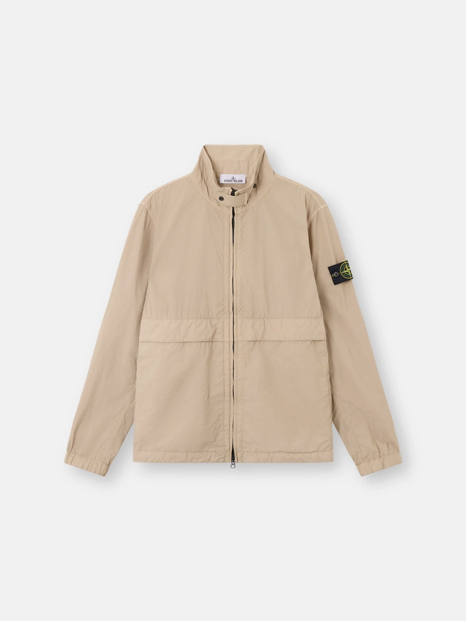 Stand collar jacket in brushed nylon tela, featuring a snap-fastened flap at the collar, multiple pockets, elasticated cuffs, and concealed two-way zipper fastening. Garment dyed with anti-drop. FABRIC RESEARCH AND TREATMENT Stand collar jacket made of a special recycled nylon tela. Thanks to its composition and to the brushing treatment, it offers a feeling of softness and comfort similar to cotton but with the durability and resistance specific to nylon fibers. Garment dyed with the addition of a special anti-drop agent. STYLE AND FIT Stand collar with snap-fastened flap. Top-entry hand pockets with fixed flap and concealed snap, with second vertical hand pockets. Back yoke. Stone Island badge on left sleeve. Elasticated cuffs. Elasticated sides of hem. Concealed two-way zipper fastening. COMPOSITION AND CARE External Fabric: 100% Polyamide / Nylon Secondary Fabric: 100% Polyamide / Nylon Coating: 100% Polyurethanic Resin