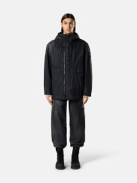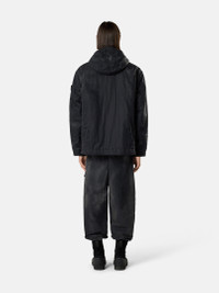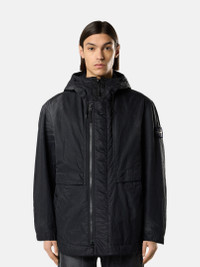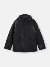 Hooded jacket in compact nylon, manually sprayed with a reflective solution creating a marbled appearance, featuring an overlay flap at the shoulders and a two-way zipper. Garment dyed with anti-drop. FABRIC RESEARCH AND TREATMENT Hooded jacket in a compact nylon fabric. After garment dyeing, it is manually sprayed with a highly reflective solution containing thousands of glass microspheres, which glide over the fabric’s anti-drop surface, creating a marbled appearance. The artisanal process renders each garment unique and unrepeatable. STYLE AND FIT Shaped hood with visor and drawstring. Angled hand pockets with snap. Internal top-entry pocket with button and Compass logo embroidery. Overlay flap at shoulders. White Stone Island research badge on left sleeve. Two-way zipper fastening. COMPOSITION AND CARE External Fabric: 100% Polyamide / Nylon Lining: 100% Polyamide / Nylon Padding: 100% Polyester