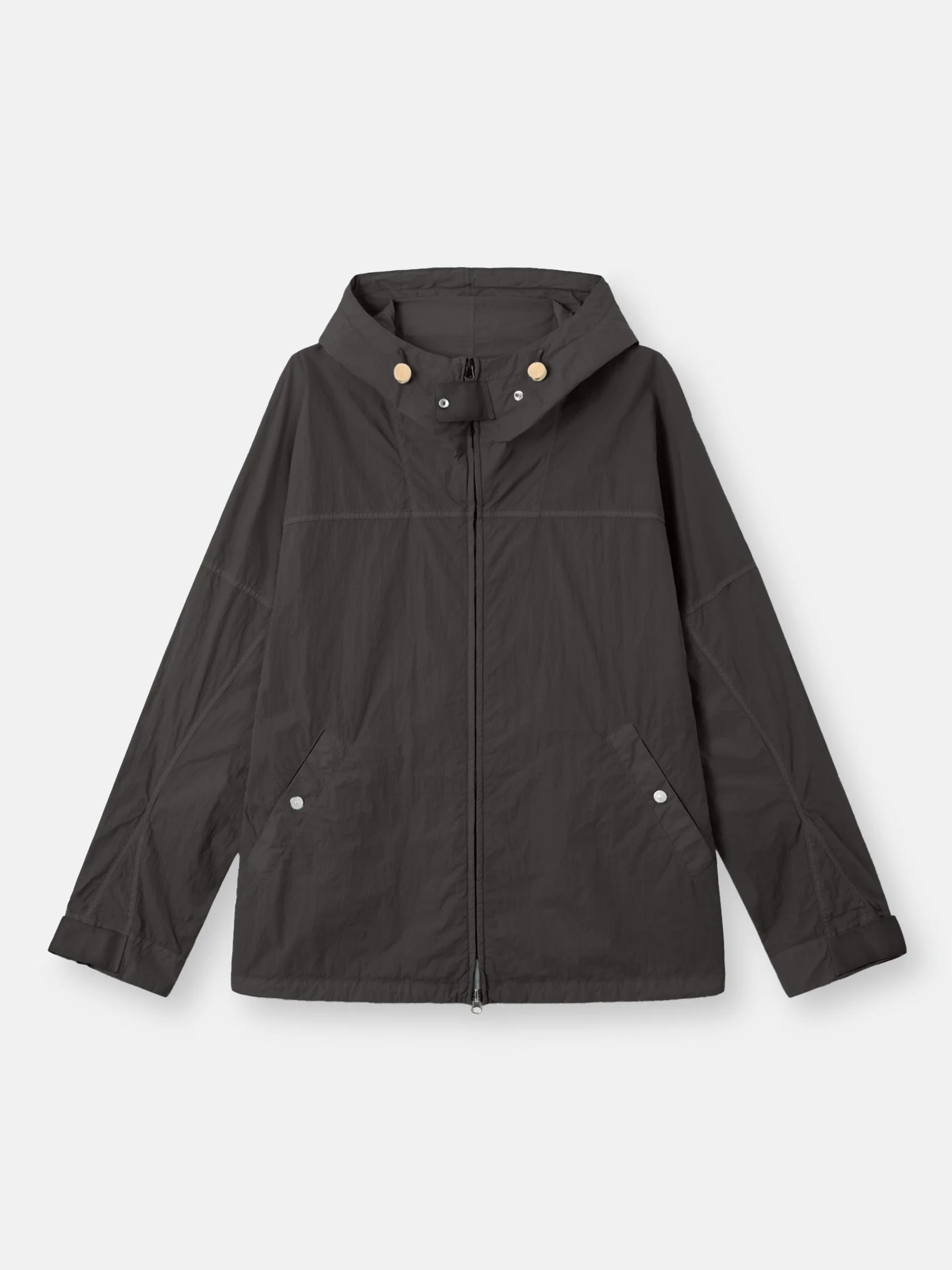 Hooded jacket in micro-brushed nylon featuring a snap-fastened throat latch, snap hand pockets, adjustable cuffs, a drawstring hem, and concealed two-way zipper. Garment dyed with anti-drop. FABRIC RESEARCH AND TREATMENT Hooded jacket made from a micro-brushed nylon. The finishing treatment lends a soft and comfortable feel to the fabric. Garment dyed with the addition of a special anti-drop agent. STYLE AND FIT Double-layer hood featuring drawstring with wood aglets and tape snap-fastened throat latch. Front and back yoke. Angled welt hand pockets with snap. Internal top-entry pockets. Adjustable cuffs with tape strap and snap. Reflective Stone Island Marina print on lower back. Drawstring with wood aglets at hem. Concealed two-way zipper fastening. COMPOSITION AND CARE 100% Polyamide / Nylon