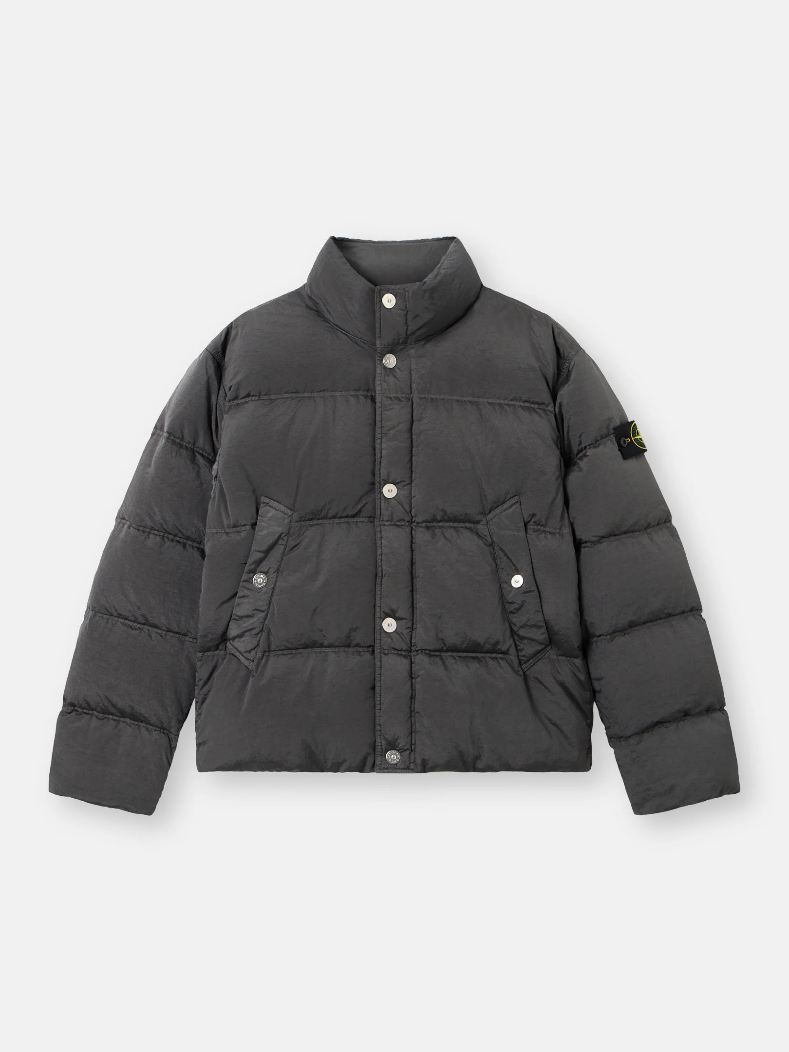 Down jacket in iridescent Nylon Metal made from ECONYL® regenerated yarns, featuring pockets and two-way zipper. Garment dyed with a double color recipe and anti-drop. FABRIC RESEARCH AND TREATMENT Down jacket in Stone Island's iridescent Nylon Metal fabric. The evolution of this iconic fabric sees the use of ECONYL® regenerated yarns: the life-ended nylon, pre- and post-consumer, is recycled with a complex depolymerization process to create this fiber that features the same intrinsic characteristics of nylon from fossil raw material. Garment dyed with a double color recipe and the addition of a special anti-drop agent. Padded with the finest feathers specifically treated to withstand the garment dyeing procedure. RDS - Responsible Down Standard certified. STYLE AND FIT Standing collar. Slanted hand pockets with snap. Stone Island badge on left sleeve. Two-way zipper under snap-fastened placket. COMPOSITION AND CARE External Fabric: 100% Polyamide / Nylon. Lining: 100% Polyamide / Nylon. Padding: Duck Down (Minimum 80% Down) 80% Duck Down 20% Duck Feather. Contains Non-textile Parts Of Animal Origin