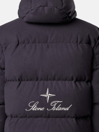 Hooded down jacket in cotton moleskin with a double-faced satin weave, resin-treated for wind and mild water resistance, featuring an archival Stone Island logo. Garment dyed with anti-drop. FABRIC RESEARCH AND TREATMENT Hooded down jacket made from a cotton moleskin. The fabric's double-faced satin weave is brushed and sheared externally to achieve a warm and velvet-like hand. The fabric is resin-treated with a special anti-drop agent, making it wind resistant and mildly water resistant. RDS - Responsible Down Standard certified. STYLE AND FIT Padded hood. Angled hand pockets with snap. Embroidered archival Stone Island logo on back. Elasticated cuffs and hem. Zipper fastening under snap-fastened placket. COMPOSITION AND CARE External Fabric: 97% Cotton 3% Elastane / Spandex. Lining: 100% Polyamide / Nylon. Padding: Duck Down (Minimum 80% Down) 80% Duck Down 20% Duck Feather. Contains Non-textile Parts Of Animal Origin