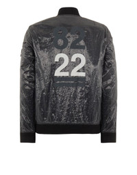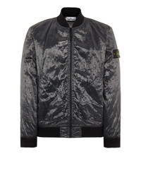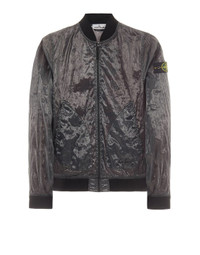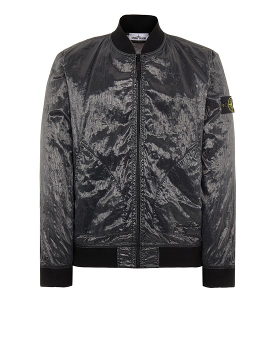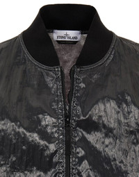 FABRIC RESEARCH AND TREATMENT PIATTINA_GARMENT DYED 82/22: Bomber Jacket made in a canvas consisting of polyester monofilaments in the warp and flat nylon threads in the weft. The shiny and transparent fabric bears the 82/22 graphic dedicated to the 40 years of Stone Island, made with the jacquard technique in black polyester and cotton, which takes the dyeing procedure. Garment dyed with the addition of an anti-drop agent. STYLE Ribbed collar. Rounded patch hand pockets with slanting entrance; the left one features the Stone Island 40th anniversary embroidery. Stone Island badge on the left sleeve. Ribbed cuffs. 82/22 jacquard artwork on back. Ribbed bottom band. Two-way zip fastening, edged by piping. COMPOSITION External fabric: 64% Polyamide / Nylon, 36% Polyester - excluding the decoration Secondary fabric: 100% Polyamide / Nylon