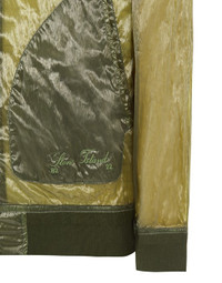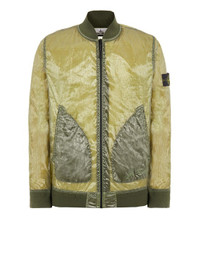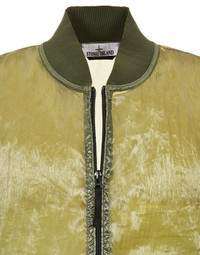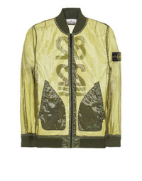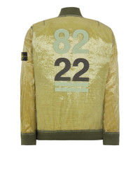 FABRIC RESEARCH AND TREATMENT PIATTINA_GARMENT DYED 82/22: Bomber Jacket made in a canvas consisting of polyester monofilaments in the warp and flat nylon threads in the weft. The shiny and transparent fabric bears the 82/22 graphic dedicated to the 40 years of Stone Island, made with the jacquard technique in black polyester and cotton, which takes the dyeing procedure. Garment dyed with the addition of an anti-drop agent. STYLE Ribbed collar. Rounded patch hand pockets with slanting entrance; the left one features the Stone Island 40th anniversary embroidery. Stone Island badge on the left sleeve. Ribbed cuffs. 82/22 jacquard artwork on back. Ribbed bottom band. Two-way zip fastening, edged by piping. COMPOSITION External fabric: 64% Polyamide / Nylon, 36% Polyester - excluding the decoration Secondary fabric: 100% Polyamide / Nylon