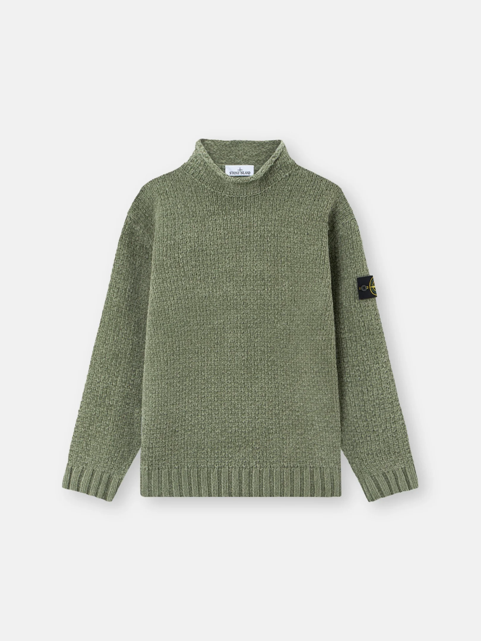 Knit mock neck sweater in cotton chenille featuring reverse stitch bands down the sleeves and back, with full ribbed trims. Gauge 3. FABRIC RESEARCH AND TREATMENT Knit mock neck sweater in cotton chenille. Reverse bobble stitch. Gauge 3. STYLE AND FIT Ribbed mock neckline. Stone Island badge on left sleeve. Reverse stitch band down back of sleeves and sides of back. Full ribbed cuffs and bottom band. Oversized fit. COMPOSITION AND CARE 100% Cotton