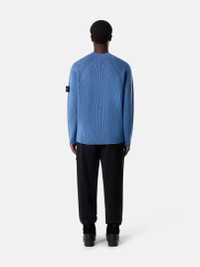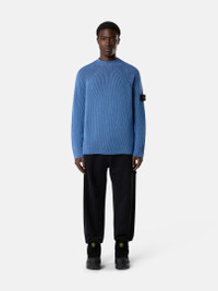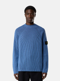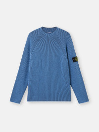Knit mock neck sweater in RWS wool with full ribbing in two contrasting yarns worked using the vanise technique for added depth, featuring raglan sleeves. Gauge 7. FABRIC RESEARCH AND TREATMENT Knit mock neck sweater with full ribbing in RWS certified wool with two different colored yarns, worked with the vanise technique to obtain a deeper perception of the rib and contrasting color placements. Gauge 7. The Responsible Wool Standard (RWS) describes and certifies animal welfare and land-management practices in wool production and tracks the certified material from farm to final product. STYLE AND FIT Stitching along neckline. Raglan sleeves. Stone Island badge on left sleeve. Plain hem on cuffs and bottom. Loose fit. COMPOSITION AND CARE 57% Virgin Wool 35% Cotton 7% Polyamide / Nylon 1% Elastane / Spandex