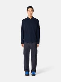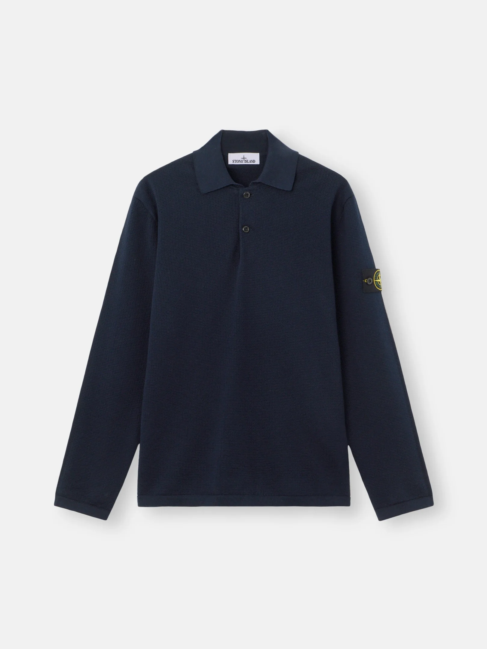 Knit long-sleeve polo in micro stitch soft organic cotton, featuring a two-button fastening, contrast-knit bands, and raised seam details. Gauge 14. FABRIC RESEARCH AND TREATMENT Knit long-sleeve polo in micro stitch soft organic cotton. Gauge 14. STYLE AND FIT Ribbed collar with two-button fastening. Contrast-knit band around armholes. Raised seam detail on back shoulders. Raglan sleeves on back. Stone Island badge on left sleeve. Ribbed cuffs and hem. Loose fit. COMPOSITION AND CARE 100% Cotton