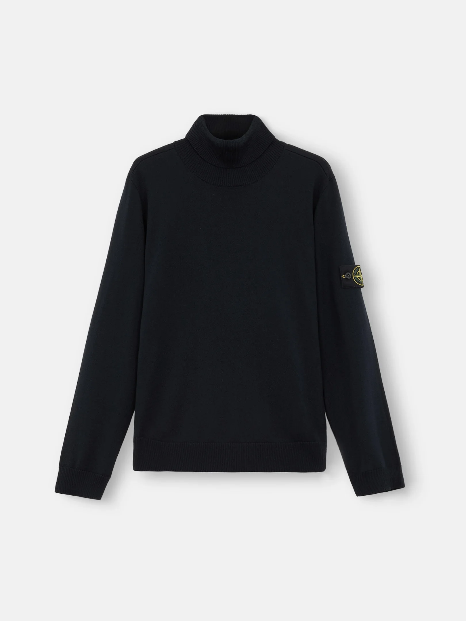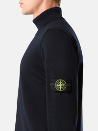 Knit turtleneck sweater in light RWS pure wool featuring a ribbed collar, cuffs, and bottom band. Gauge 14. FABRIC RESEARCH AND TREATMENT Knit turtleneck sweater in light RWS pure wool. Stockinette stitch. Gauge 14. STYLE AND FIT Ribbed collar. Stone Island badge on left sleeve. Ribbed cuffs and bottom band. Regular fit. COMPOSITION AND CARE 100% Virgin Wool