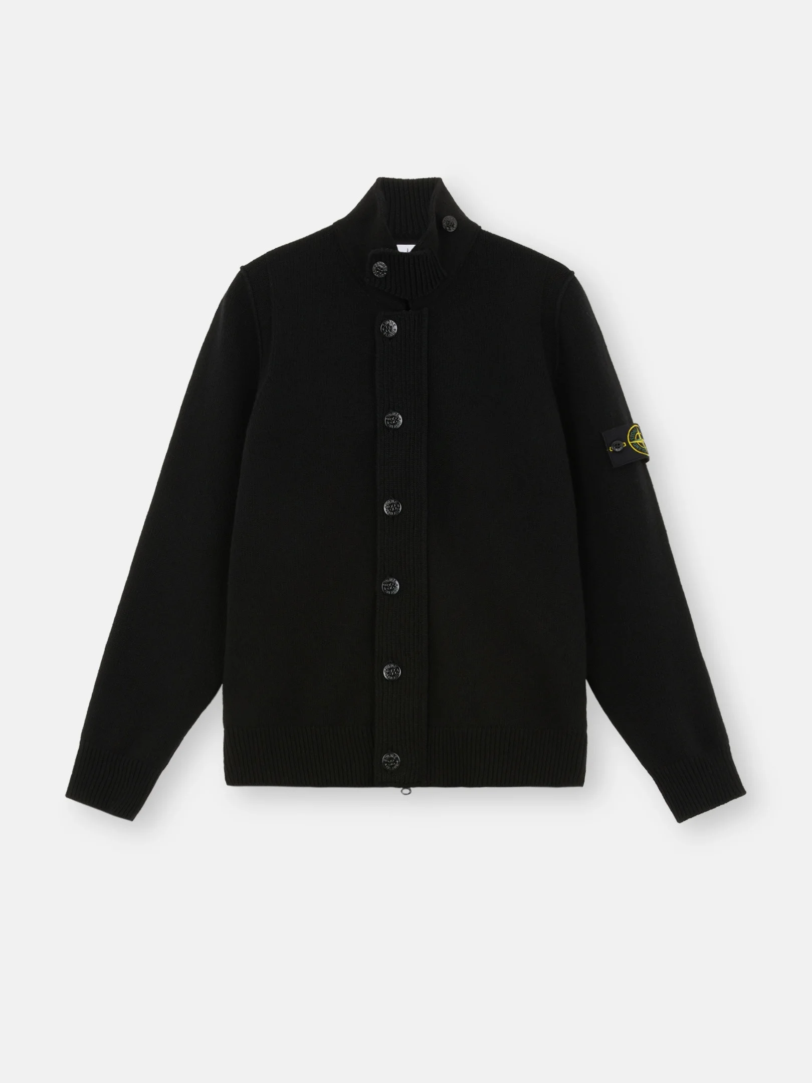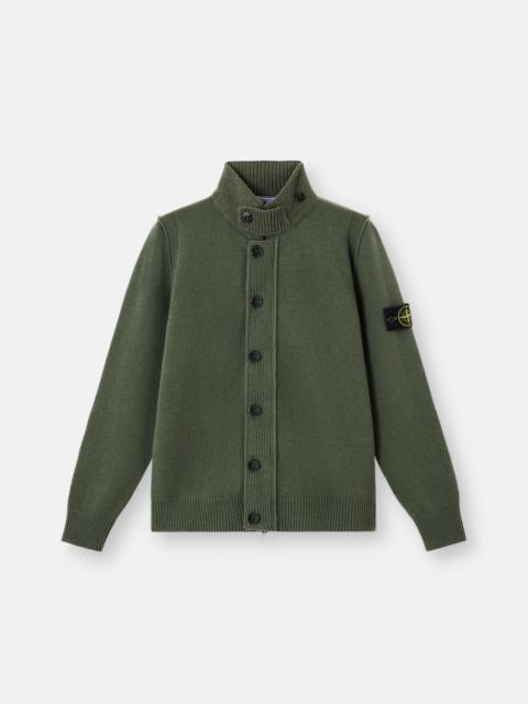Knit button-up sweater in a lamb wool and nylon blend featuring a felt-lined collar with button strap and a two-way zipper under a button-fastened placket. Gauge 7. FABRIC RESEARCH AND TREATMENT Knit button-up sweater in lamb wool and nylon blend. Stockinette stitch. Gauge 7. STYLE AND FIT Ribbed felt-lined stand collar with knit strap that can be buttoned across neck or back onto collar. Reverse stitch band at shoulders and along armholes. Stone Island badge on left sleeve. Ribbed cuffs and bottom band. Two-way zipper under felt-lined button placket. Regular fit. COMPOSITION AND CARE Garment: 80% Wool 20% Polyamide / Nylon. Garment Details: 85% Wool 10% Polyester 5% Polyamide / Nylon