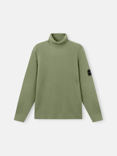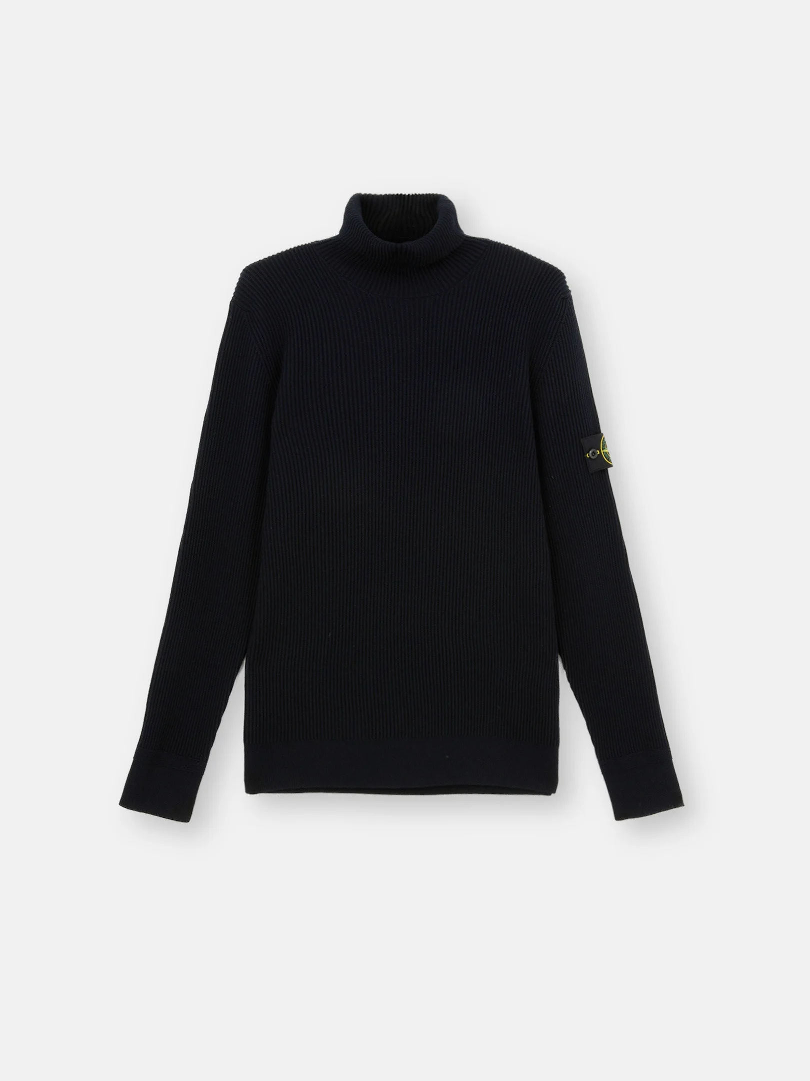 Knit turtleneck sweater in full rib RWS wool featuring a ribbed collar, finely ribbed cuffs with horizontal stitching, and a finely ribbed bottom band. Gauge 12. FABRIC RESEARCH AND TREATMENT Knit turtleneck sweater in full rib RWS wool. Gauge 12. STYLE AND FIT Ribbed collar. Stone Island badge on left sleeve. Finely ribbed cuffs with horizontal stitching along hem. Finely ribbed bottom band. Regular fit. COMPOSITION AND CARE 100% Virgin Wool