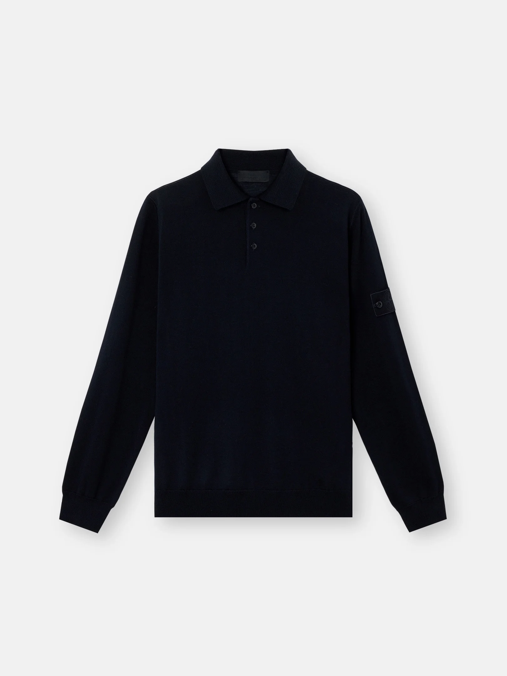 Knit long-sleeve polo sweater in light RWS pure wool with stockinette stitch, ribbed trims, and button fastening. Gauge 14. FABRIC RESEARCH AND TREATMENT Ghost pieces, derived from the concept of camouflage, are totally monochromatic. Even the Stone Island badge is created in a special monocolor version to blend in with the garment. Knit long-sleeve polo sweater in light RWS pure wool. Stockinette stitch. Gauge 14. STYLE AND FIT Ribbed collar. Three-button neck fastening. Stone Island Ghost badge on left sleeve. Ribbed cuffs and bottom band. Regular fit. COMPOSITION AND CARE 100% Virgin Wool