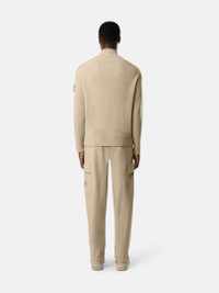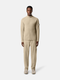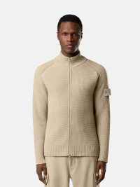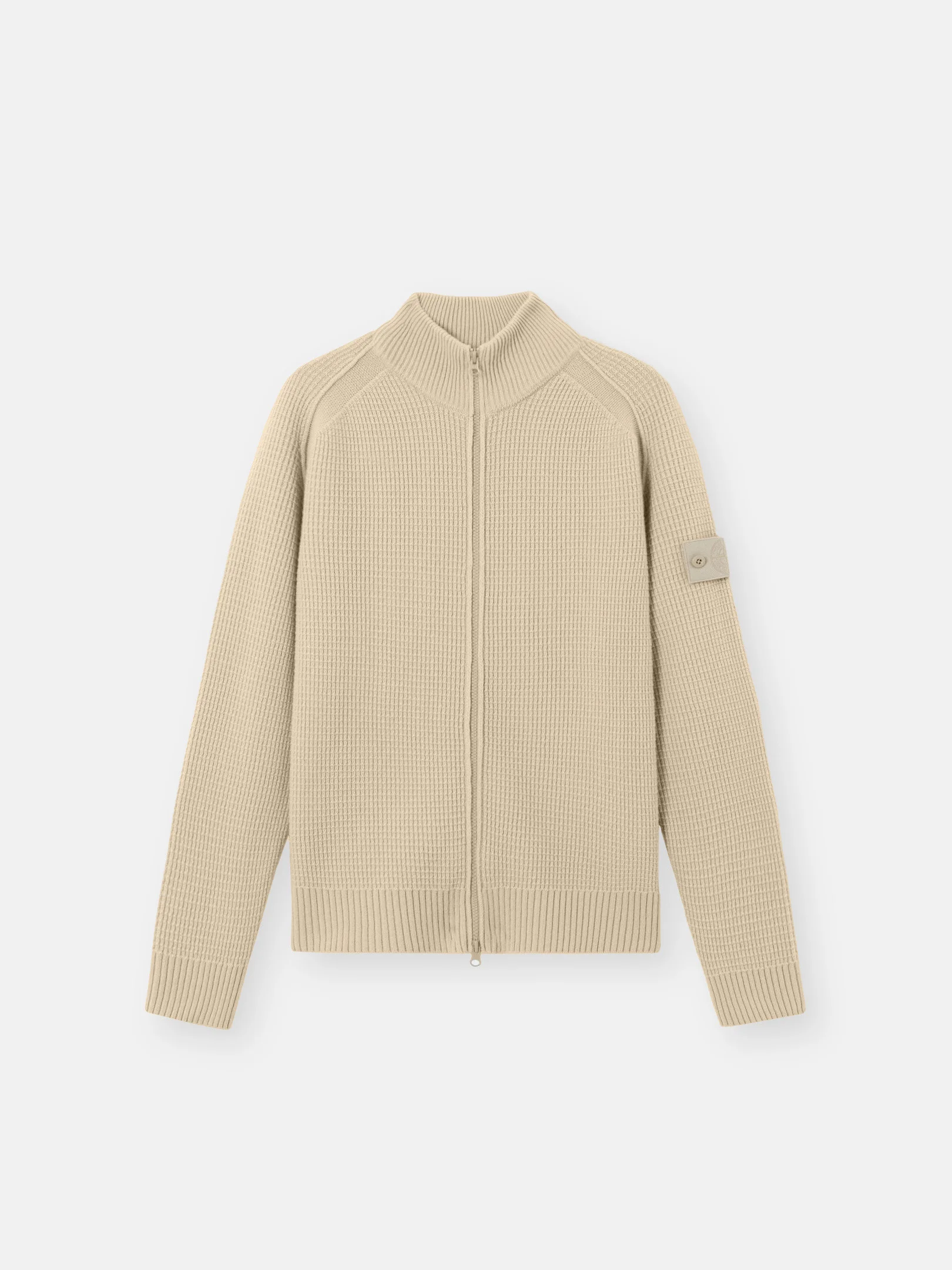 Knit zipper-up sweater in RWS Geelong wool with waffle stitch, raglan sleeves, and ribbed trims. Gauge 7. FABRIC RESEARCH AND TREATMENT Ghost pieces, derived from the concept of camouflage, are totally monochromatic. Even the Stone Island badge is created in a special monocolor version to blend in with the garment. Knit zipper-up sweater in RWS Geelong wool. Waffle stitch. Gauge 7. STYLE AND FIT Ribbed standing collar. Reverse stitch band along seams of raglan sleeves. Stone Island Ghost badge on left sleeve. Ribbed cuffs and bottom band. Loose fit. COMPOSITION AND CARE 100% Virgin Wool