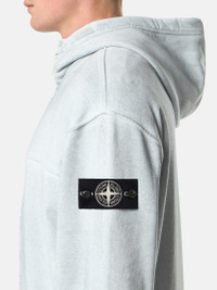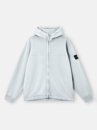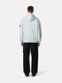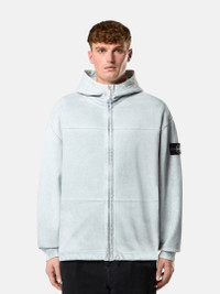 Zipper-up hooded sweatshirt in organic cotton fleece laminated with a highly reflective film and washed to create a worn appearance, featuring multiple pockets and a two-way zipper. Heavyweight. Garment dyed. FABRIC RESEARCH AND TREATMENT Zipper-up hooded sweatshirt in organic cotton fleece. Heavyweight. After the garment dyeing process, this garment is laminated with a highly reflective film that incorporates thousands of glass microspheres. The piece is then washed to remove any non-adhered residues and create a worn appearance. The artisanal process makes each garment unique and unrepeatable. STYLE AND FIT Double-layer hood. Front yoke with raglan sleeves on back. Vertical hand pockets with internal tape reinforcement. Internal top-entry pockets. White Stone Island research badge on left sleeve. Ribbed cuffs. Tape drawcord at hem. Concealed two-way zipper fastening. Oversized fit. COMPOSITION AND CARE External Fabric: 100% Cotton Ribbing: 100% Cotton Hood Lining: 100% Cotton
