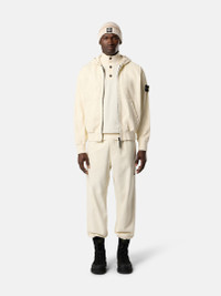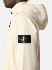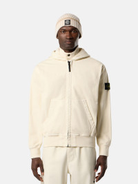 Hooded zipper-up sweatshirt in organic panama cotton featuring ribbed cotton inserts and hand pockets. Garment dyed with the 'OLD' treatment for a slightly worn appearance. FABRIC RESEARCH AND TREATMENT Hooded zipper-up sweatshirt in organic panama cotton. Garment dyed with the 'OLD' treatment, an exclusive dyeing treatment and subsequent fading on the finished garment for a slightly worn and three-dimensional appearance. STYLE AND FIT Hood with ribbed cotton lining around contour and fixed drawstring. Ribbed cotton inserts at shoulders, under armholes, and on sides. Hand patch pockets with slanted entrance. Stone Island badge on left sleeve. Ribbed cotton cuffs and bottom band. Oversized fit. COMPOSITION AND CARE External Fabric: 100% Cotton. Secondary Fabric: 96% Cotton 4% Elastane / Spandex. Hood Lining: 100% Cotton