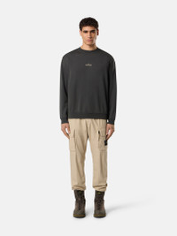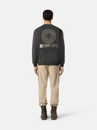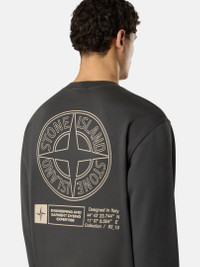 Crewneck sweatshirt in cotton fleece, featuring the Stone Island logo on the chest, a large Compass print with text on the back, and elasticated cuffs. Garment dyed. FABRIC RESEARCH AND TREATMENT Crewneck sweatshirt in cotton fleece with ‘Industrial Four’ print. Garment dyed. STYLE AND FIT Ribbed neckline. Stone Island logo print on chest. Elasticated ribbed cuffs and bottom band. On back, large print of Stone Island Compass logo and accompanying text. Oversized fit. COMPOSITION AND CARE External Fabric: 100% Cotton. Ribbing: 99% Cotton 1% Elastane / Spandex