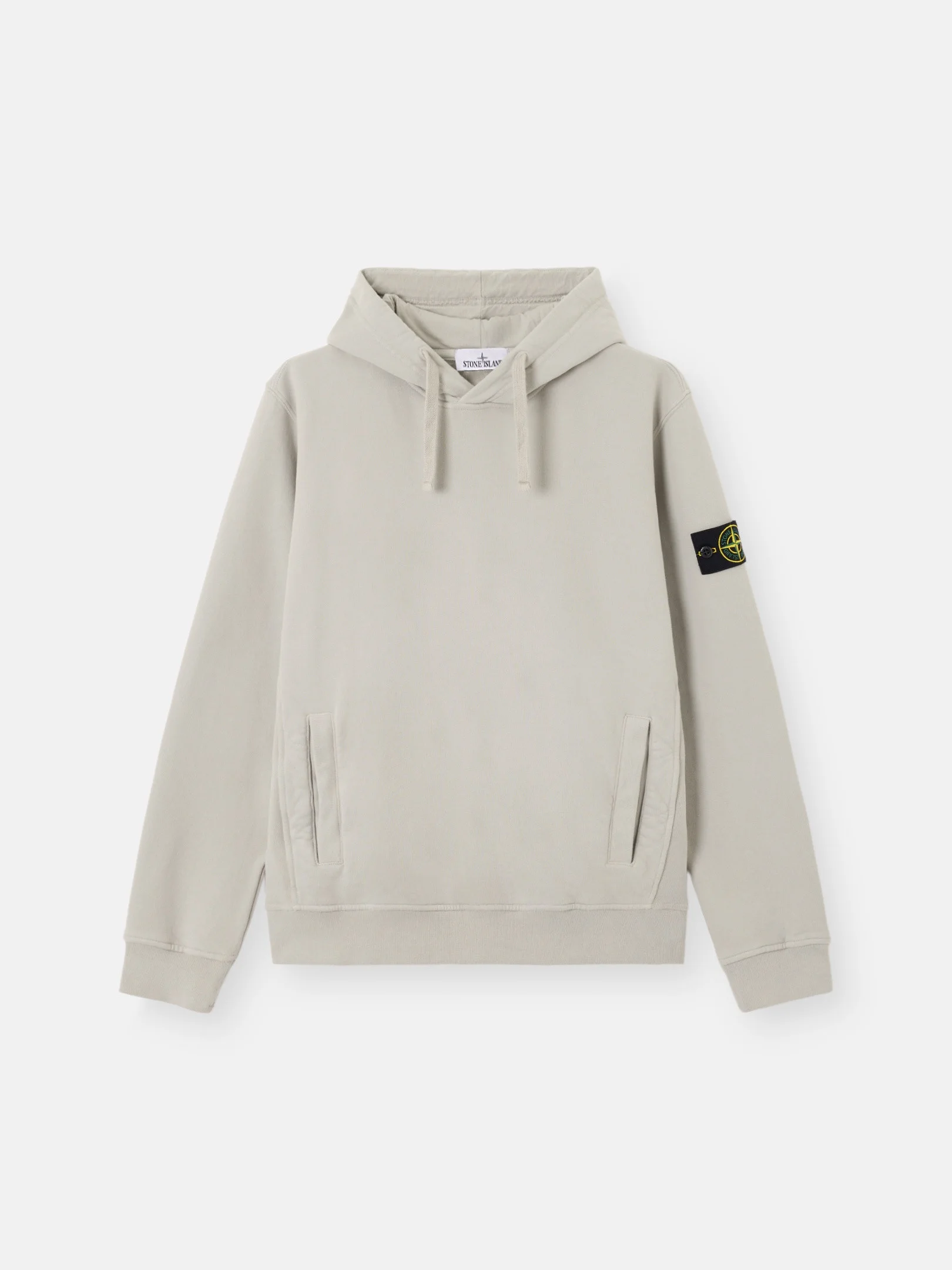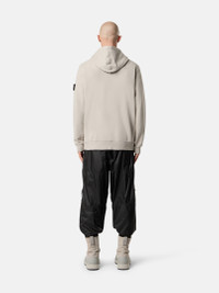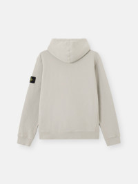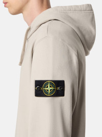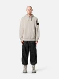 Hooded sweatshirt in brushed organic cotton fleece featuring a pouch pocket with ribbed trim, jersey-lined hood, and ribbed side bands. Garment dyed. FABRIC RESEARCH AND TREATMENT Hooded sweatshirt in brushed organic cotton fleece. Garment dyed. STYLE AND FIT Drawstring hood with cotton jersey lining. Standing-entry pouch pocket with ribbed cotton trim and inner cotton tape reinforcement. Ribbed side bands. Stone Island badge on left sleeve. Elasticated ribbed cuffs and bottom band. Regular fit. COMPOSITION AND CARE External Fabric: 100% Cotton. Secondary Fabric: 99% Cotton 1% Elastane / Spandex. Hood Lining: 100% Cotton