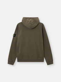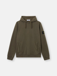 Hooded sweatshirt in brushed organic cotton fleece featuring a pouch pocket with ribbed trim, jersey-lined hood, and ribbed side bands. Garment dyed. FABRIC RESEARCH AND TREATMENT Hooded sweatshirt in brushed organic cotton fleece. Garment dyed. STYLE AND FIT Drawstring hood with cotton jersey lining. Standing-entry pouch pocket with ribbed cotton trim and inner cotton tape reinforcement. Ribbed side bands. Stone Island badge on left sleeve. Elasticated ribbed cuffs and bottom band. Regular fit. COMPOSITION AND CARE External Fabric: 100% Cotton. Secondary Fabric: 99% Cotton 1% Elastane / Spandex. Hood Lining: 100% Cotton