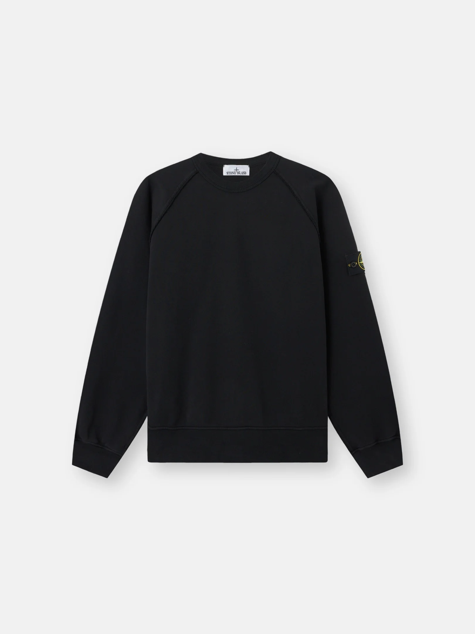 Crewneck sweatshirt in organic cotton fleece, featuring raglan sleeves, elasticated ribbed trims, and raw-edge seams with fraying. Midweight. Garment dyed. FABRIC RESEARCH AND TREATMENT Crewneck sweatshirt in organic cotton fleece. Midweight. Garment dyed. STYLE AND FIT Ribbed neckline. Raglan sleeves. Stone Island badge on left sleeve. Elasticated ribbed cuffs and bottom band. Raw-edge seams with fraying. Oversized fit. COMPOSITION AND CARE External Fabric: 100% Cotton Ribbing: 98% Cotton 2% Elastane / Spandex