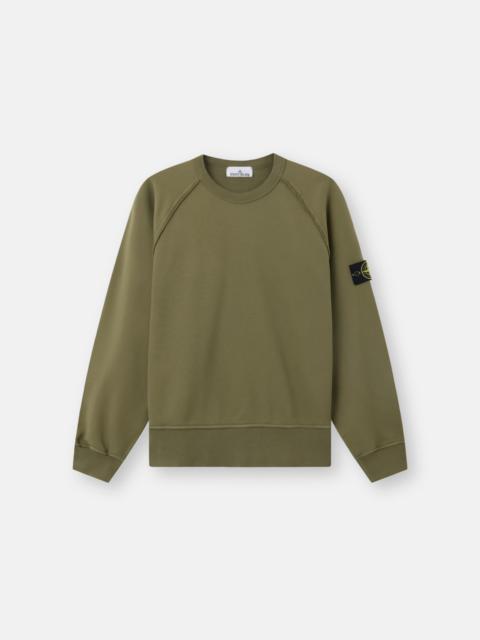 Crewneck sweatshirt in organic cotton fleece, featuring raglan sleeves, elasticated ribbed trims, and raw-edge seams with fraying. Midweight. Garment dyed. FABRIC RESEARCH AND TREATMENT Crewneck sweatshirt in organic cotton fleece. Midweight. Garment dyed. STYLE AND FIT Ribbed neckline. Raglan sleeves. Stone Island badge on left sleeve. Elasticated ribbed cuffs and bottom band. Raw-edge seams with fraying. Oversized fit. COMPOSITION AND CARE External Fabric: 100% Cotton Ribbing: 98% Cotton 2% Elastane / Spandex