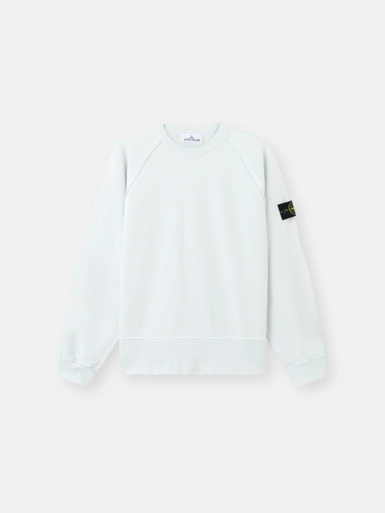 Crewneck sweatshirt in organic cotton fleece, featuring raglan sleeves, elasticated ribbed trims, and raw-edge seams with fraying. Midweight. Garment dyed. FABRIC RESEARCH AND TREATMENT Crewneck sweatshirt in organic cotton fleece. Midweight. Garment dyed. STYLE AND FIT Ribbed neckline. Raglan sleeves. Stone Island badge on left sleeve. Elasticated ribbed cuffs and bottom band. Raw-edge seams with fraying. Oversized fit. COMPOSITION AND CARE External Fabric: 100% Cotton Ribbing: 98% Cotton 2% Elastane / Spandex