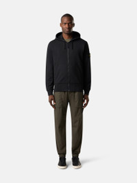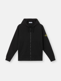 Sweatshirt in organic cotton fleece with a contour drawstring hood, hand pockets, overlock stitches, lunette detail, and zipper fastening. Garment dyed. FABRIC RESEARCH AND TREATMENT Full-zipper hooded sweatshirt in organic cotton fleece. Garment dyed. STYLE AND FIT Hood with contour drawstring. Slanted patch hand pockets. Stone Island badge on the left sleeve. Overlock stitches on hood, shoulders, armholes, and sides. Lunette with inner lining under back neckline. Ribbed cuffs and bottom band. Zipper fastening. Regular fit. COMPOSITION AND CARE 100% Cotton