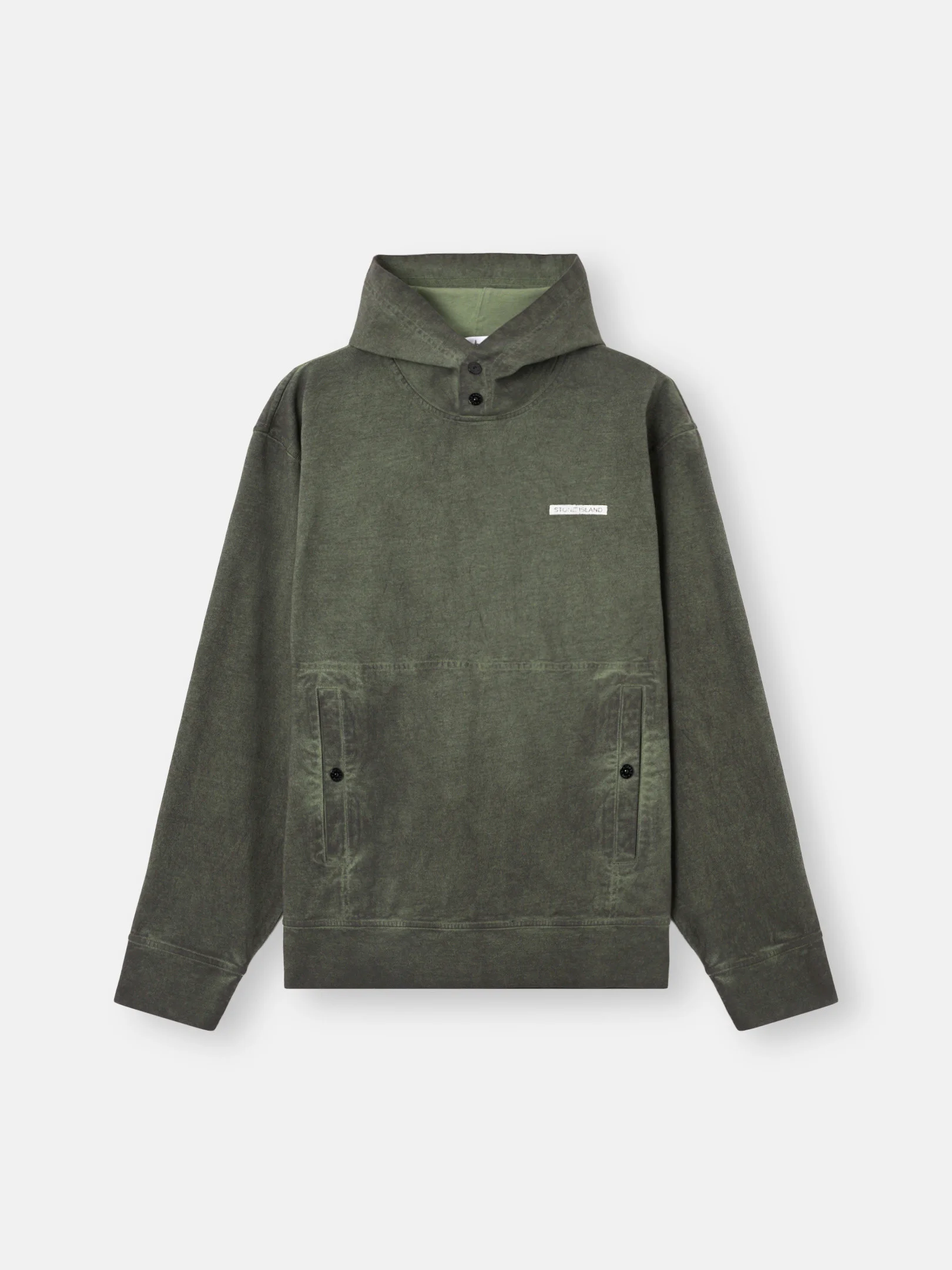 Hooded sweatshirt in compact organic cotton jersey, featuring reverse Stone Island lettering print on the chest and snap pouch pocket. Garment dyed. FABRIC RESEARCH AND TREATMENT Hooded sweatshirt in compact organic cotton jersey with ‘Velo’ effect. Garment dyed. STYLE AND FIT Two snaps at neck. Reverse print of Stone Island lettering on chest. Pouch pocket with standing pockets and snaps. Flat cuffs and bottom band. Comfort fit. COMPOSITION AND CARE Garment: 100% Cotton. Hood Lining: 100% Cotton