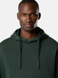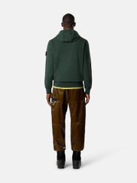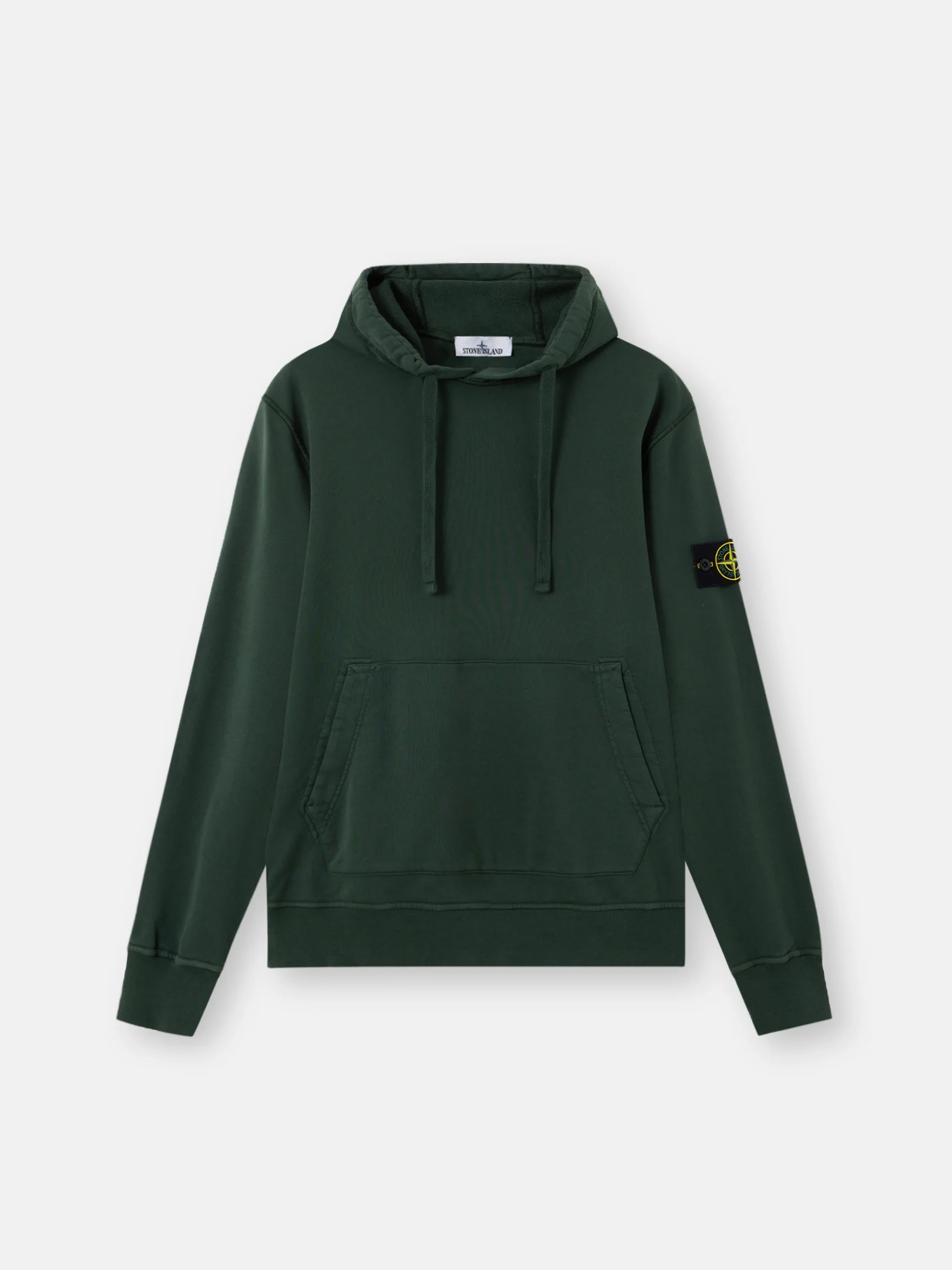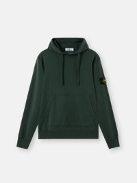 Hooded sweatshirt in organic cotton fleece featuring overlock seams, a pouch pocket with slanted entrances, and elasticated ribbed trims. Garment dyed. FABRIC RESEARCH AND TREATMENT Hooded sweatshirt in organic cotton fleece. Garment dyed. STYLE AND FIT Drawstring hood. Overlock seams. Pouch pocket with slanted entrances. Stone Island badge on left sleeve. Lunette under back neckline with inner lining. Elasticated ribbed cuffs and bottom band. Regular fit. COMPOSITION AND CARE External Fabric: 100% Cotton. Ribbing: 98% Cotton 2% Elastane / Spandex