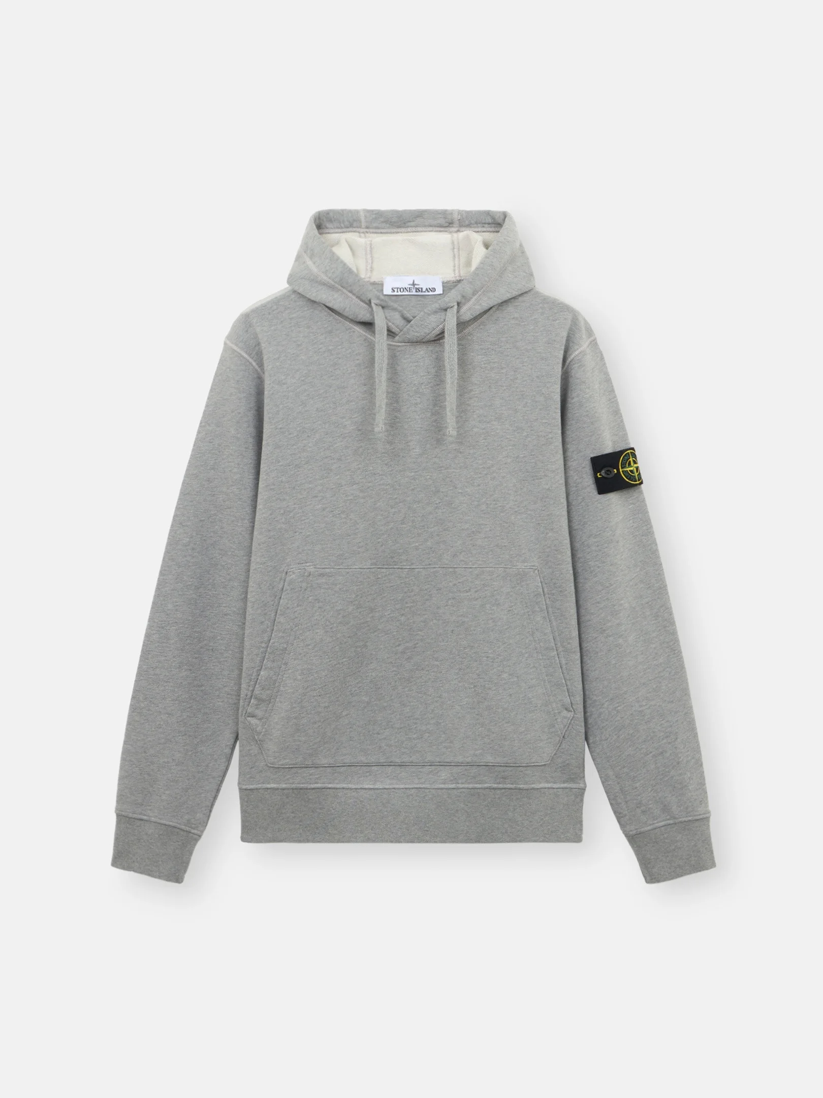 Sweatshirt in organic cotton fleece with contour drawstring hood, patch pockets, overlock seams, and lunette detail under back neckline. Garment dyed. FABRIC RESEARCH AND TREATMENT Hooded sweatshirt in organic cotton fleece. Garment dyed. STYLE AND FIT Hood with contour drawstring. Slanted patch pockets. Stone Island badge on the left sleeve. Overlock seams. Lunette with inner lining under back neckline. Ribbed cuffs and bottom band. Regular fit. COMPOSITION AND CARE External Fabric: 100% Cotton. Ribbing: 98% Cotton 2% Elastane / Spandex